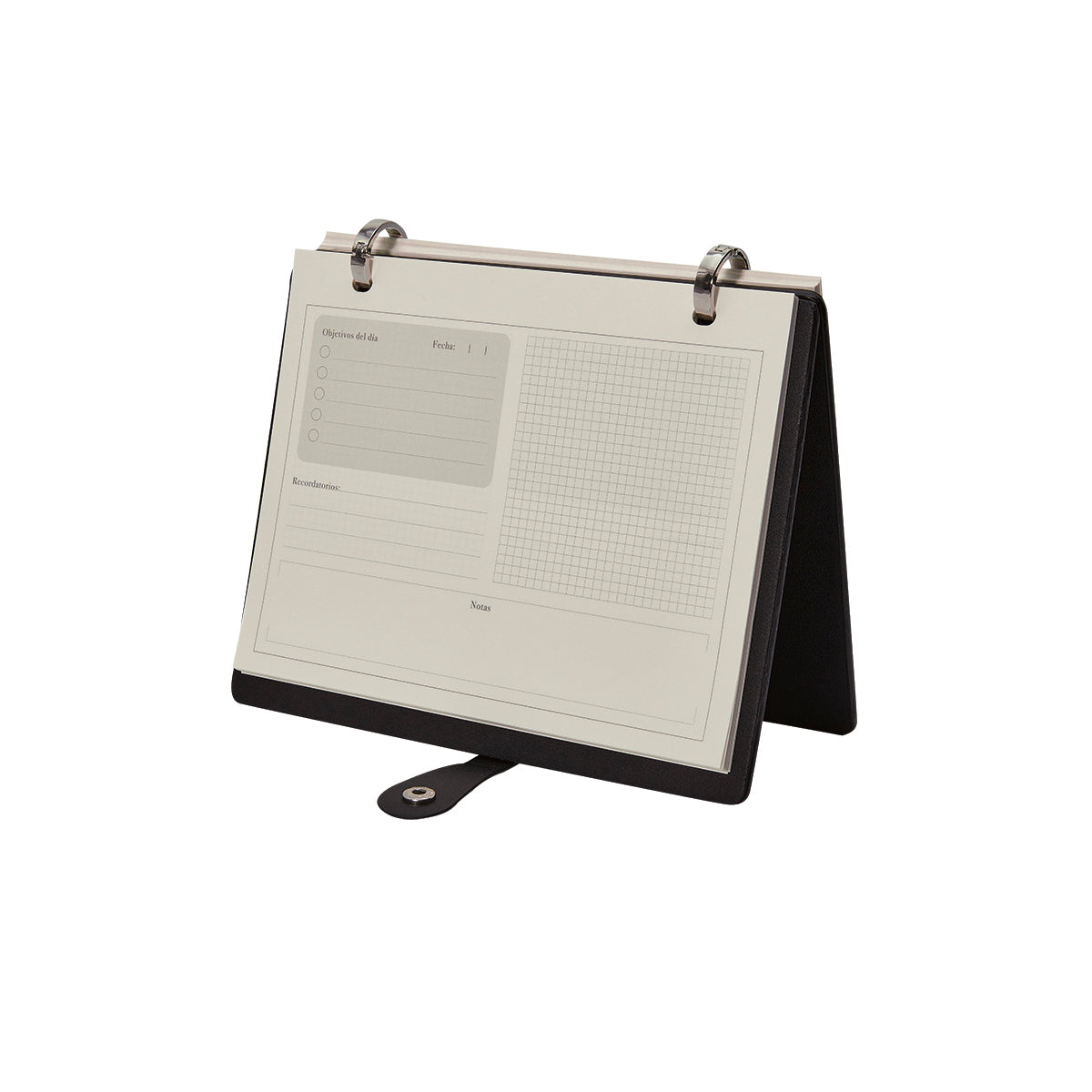 Libreta con planeador para organizar actividades diarias. Incluye dos aros metálicos, botón de presión y 60 hojas de 100 gr.