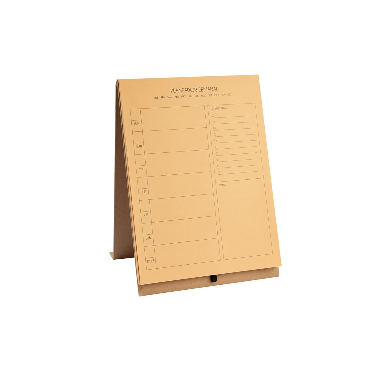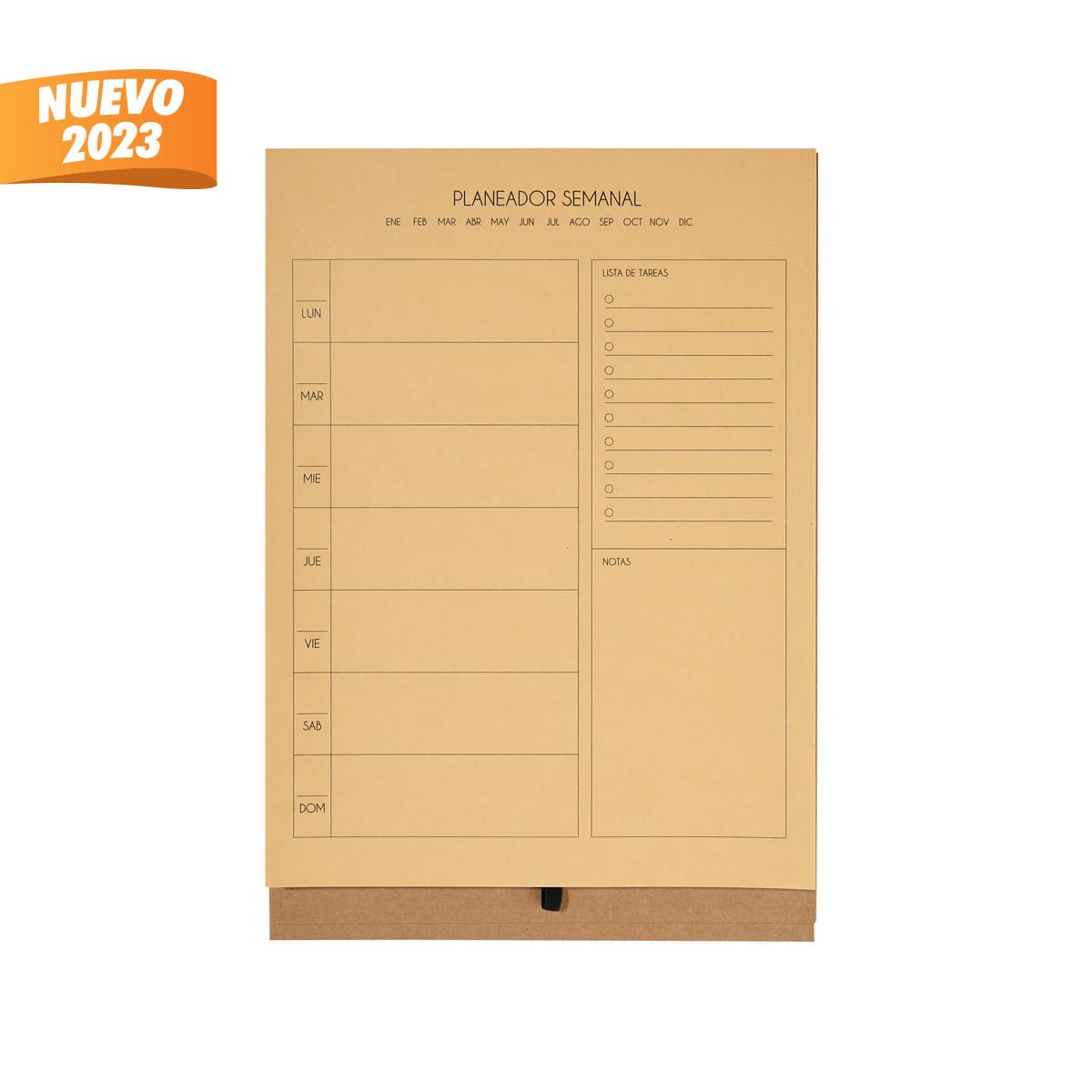 Planeador semanal tamaño profesional de pasta dura. Cuenta con 80 hojas ecológicas y elástico para bolígrafo (no incluido). Organiza fácilmente tus actividades y logra tus objetivos.