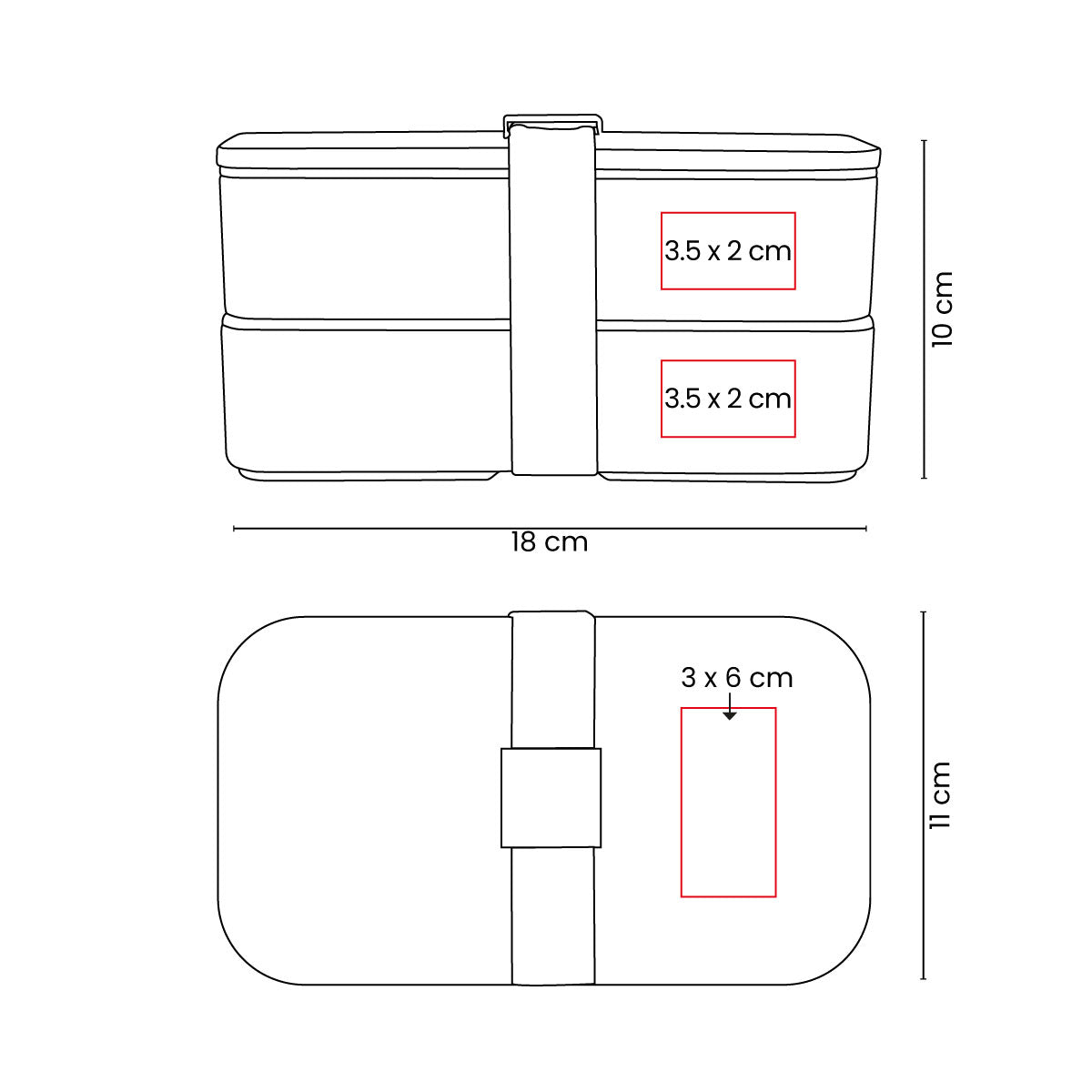 Área de impresión: 3 x 6 cm Tapa / 3.5 x 2 cm Lonchera