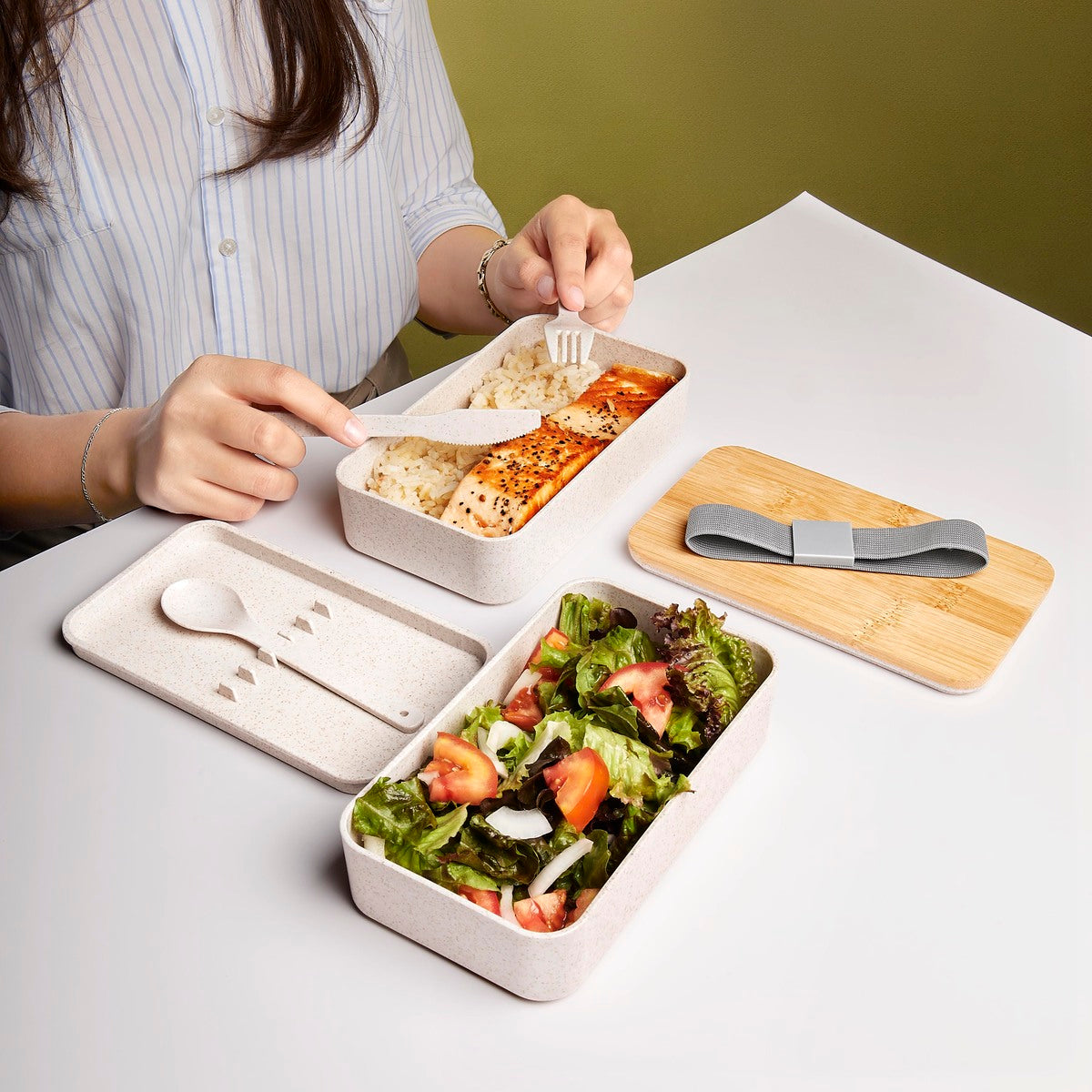 Contenedor de alimentos con doble compartimento. Capacidad total de 1 litro. Incluye tenedor, cuchillo y cuchara. Su fabricacion lo hace amigable con el medio ambiente, al incorporar fibra de Trigo en sus materiales. La elegante Tapa de bambu asegura tus alimentos y la banda elastica mantiene todo firmemente cerrado. Practico y versatil, este set es apto para lavavajillas y microondas, excluyendo la Tapa de bambu. La madera es un producto natural el cual puede presentar variaciones en tonalidades y vetas.
