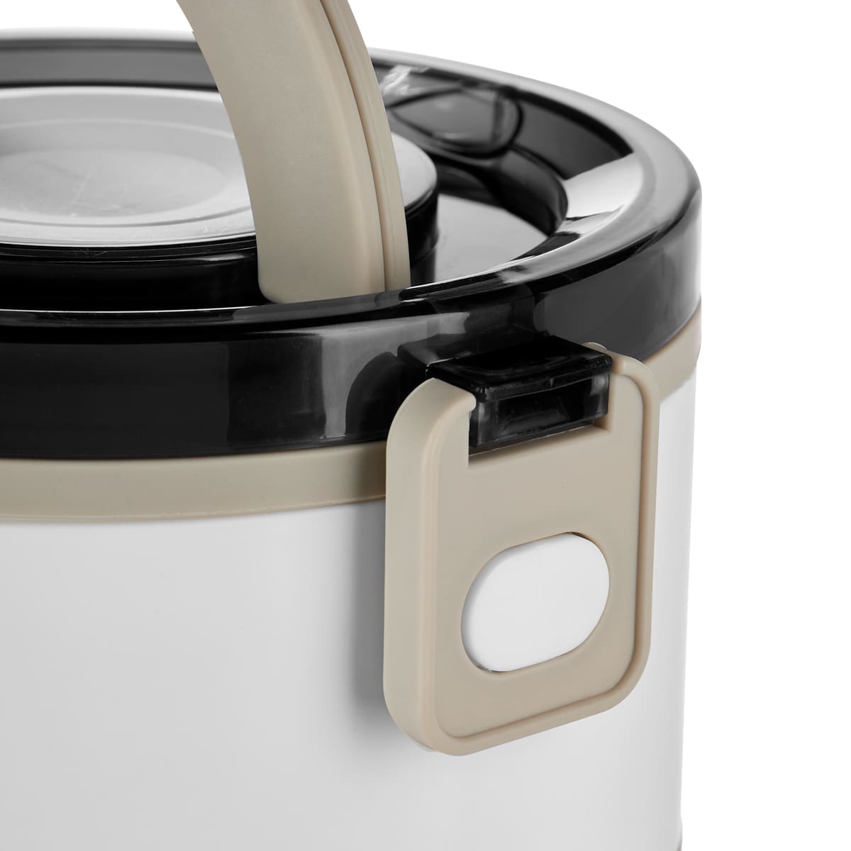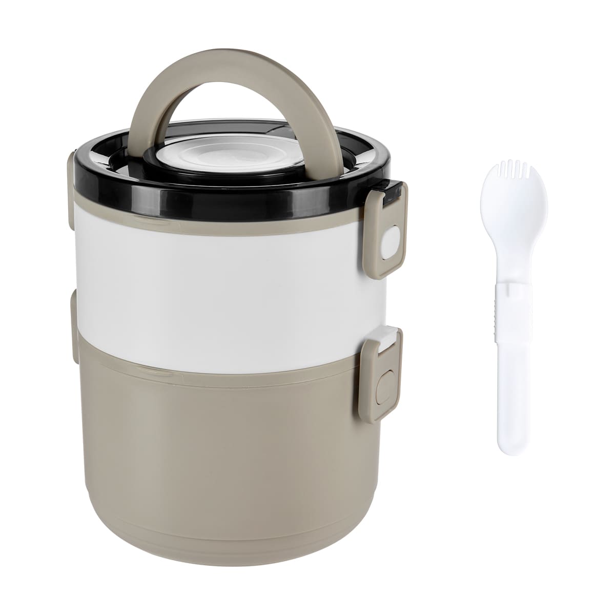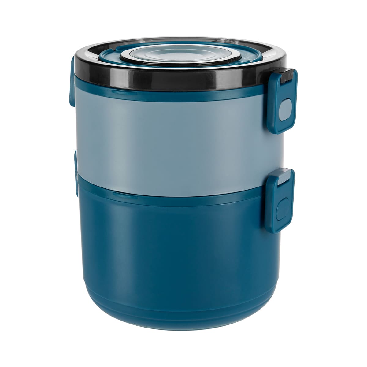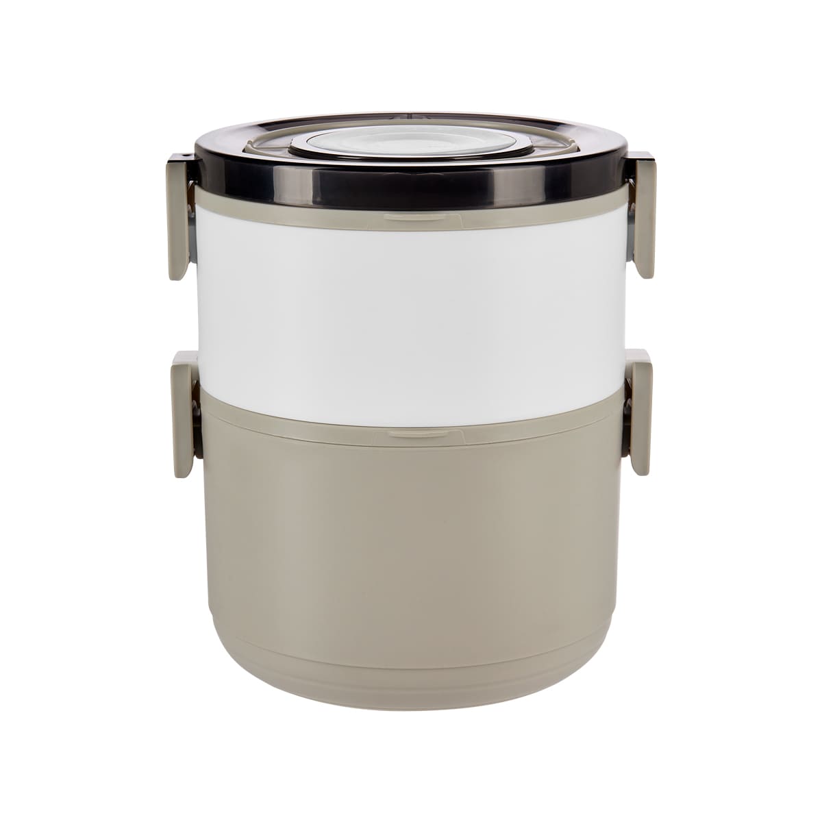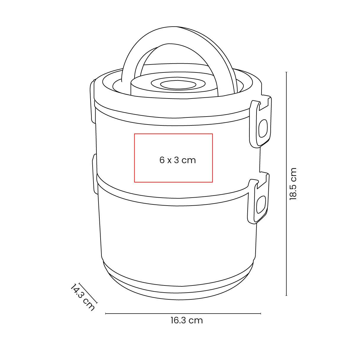 Contenedor de alimentos con dos pisos independientes que permite separar tus alimentos y no mezclar sabores. Fabricado con una pared sencilla de plástico, ideal para el uso de microondas. Cada compartimento cuenta con su tapa hermética para evitar derrames y sus broches laterales ayudan unir o separar cada elemento. Incluye cuchara de plástico, tapa con asa plegable y caja individual. Apto para el uso en microondas y lavavajillas.