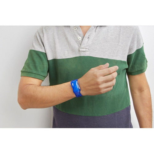 Pulsera de plástico con compartimento recargable para gel sanitizante. Broche velcro. Capacidad 15 ml.