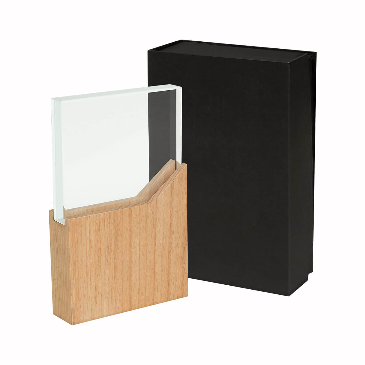 Elegante y clásico reconocimiento que combina vidrio y madera de pino. Perfecto para destacar los logros y celebraciones especiales. Incluye caja de regalo con broche imantado para cerrar y esponja interna para protección. La madera es un producto natural el cual puede presentar variaciones en tonalidades y vetas