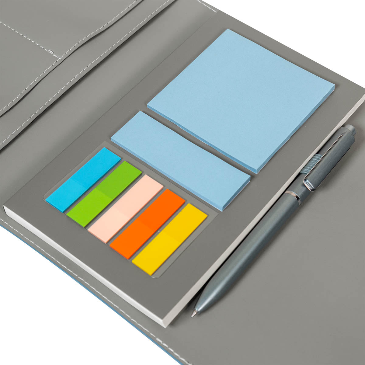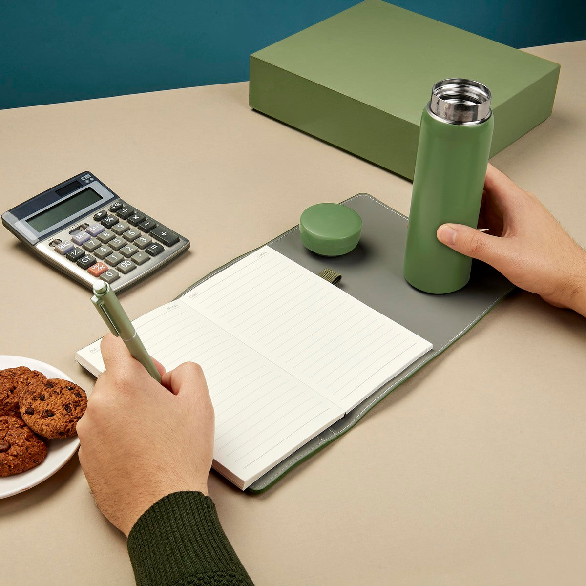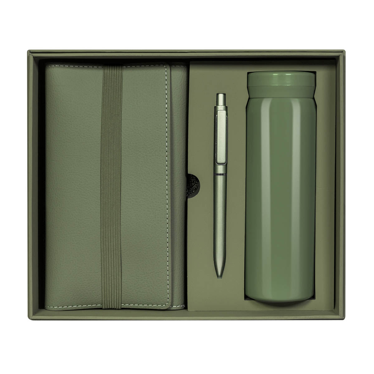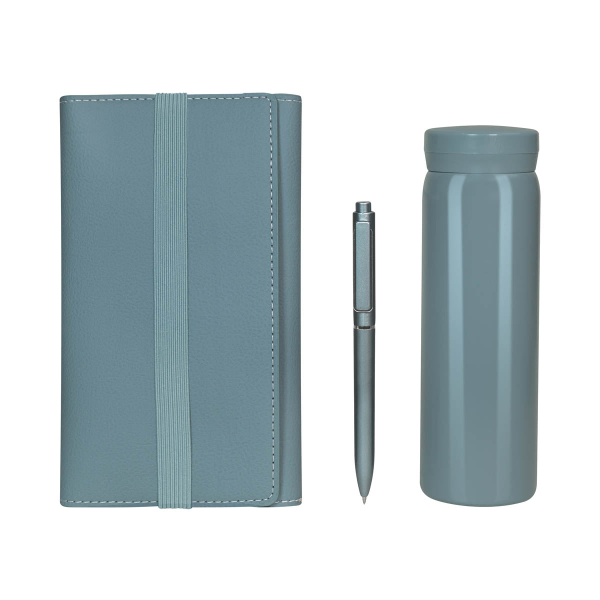 Set de regalo. Incluye: termo de doble pared metalica con tapa de plastico con sistema de rosca, boligrafo de plastico con sistema push, libreta con pasta de curpiel suave con cierre de elastico y 70 hojas a rayas, al interior de la libreta incluye dos bloques de notas adhesivas y 5 banderines, ademas de agregar compartimentos para tarjetas o pequenos documentos. Presentado con atencion al detalle en un empaque de calidad y mucho color, este set es el regalo perfecto para cualquier ocasion especial.