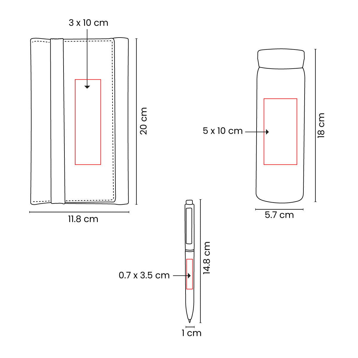 Área de impresión: 10 x 30 cm Caja / 3 x 10 cm Libreta / 0.7 x 3.5 cm Bolígrafo / 5 x 10 cm Termo