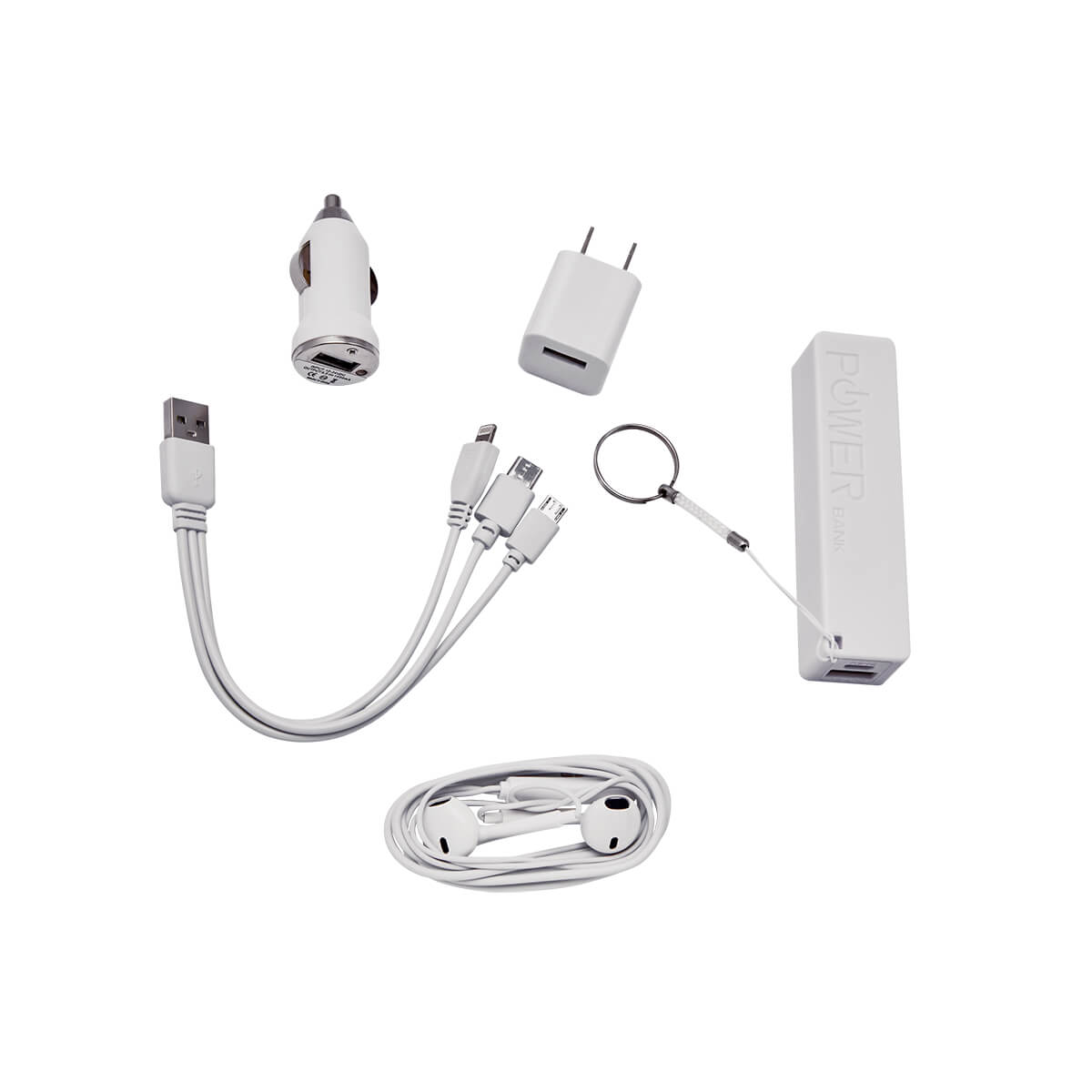 Incluye bateria auxiliar de 2,600 mAh, cargador para automovil, cargador de pared, audifonos, cable cargador USB 3-en-1 (micro USB, tipo C y lightning) y estuche.