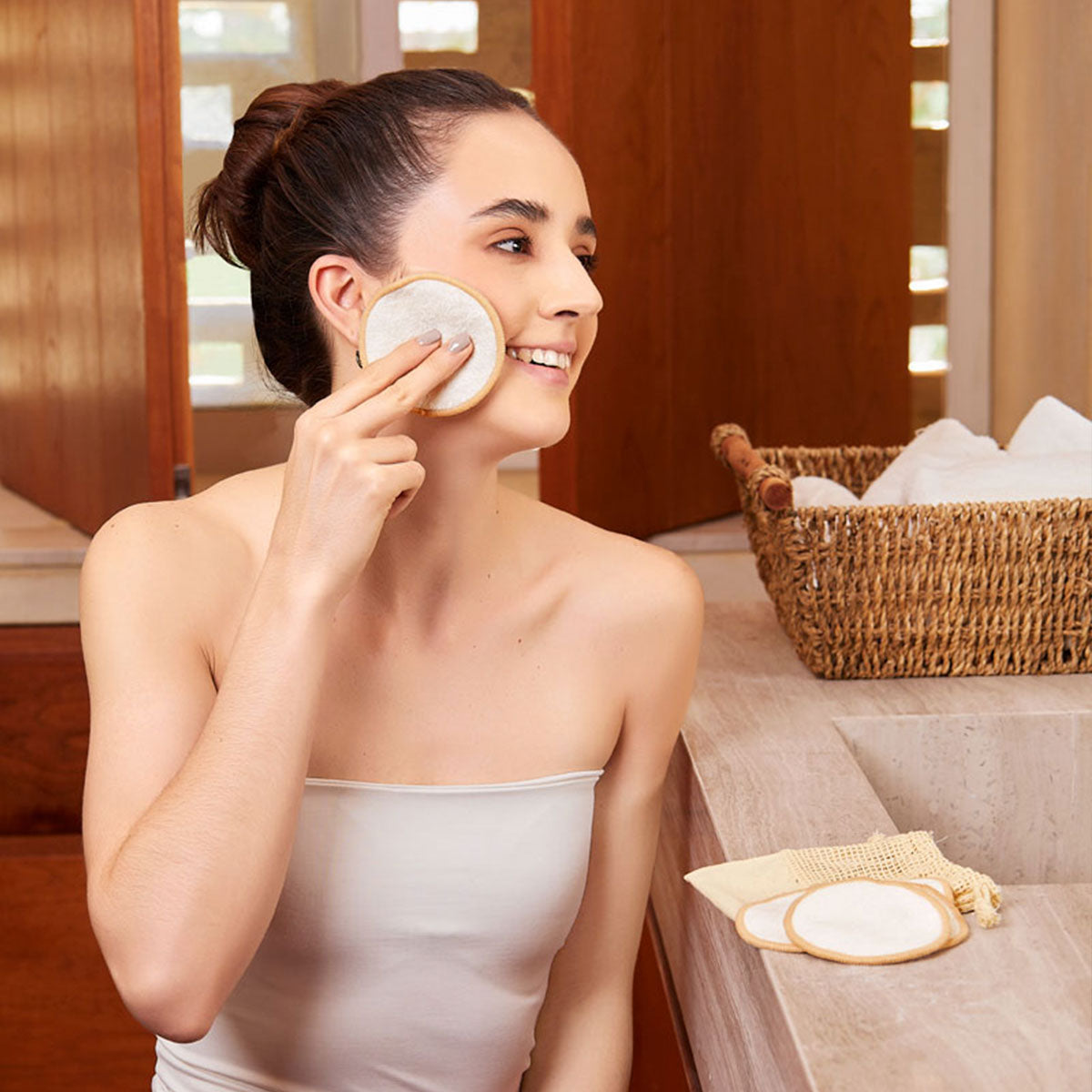 Set de 5 almohadillas desmaquillantes y reutilizables. Gracias a su material de fibra de bambu, son suaves para utilizar en tu piel. Incluye bolsa de algodon con cierre de jareta.