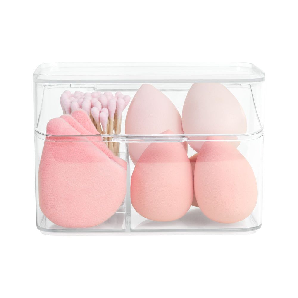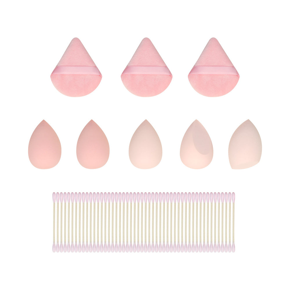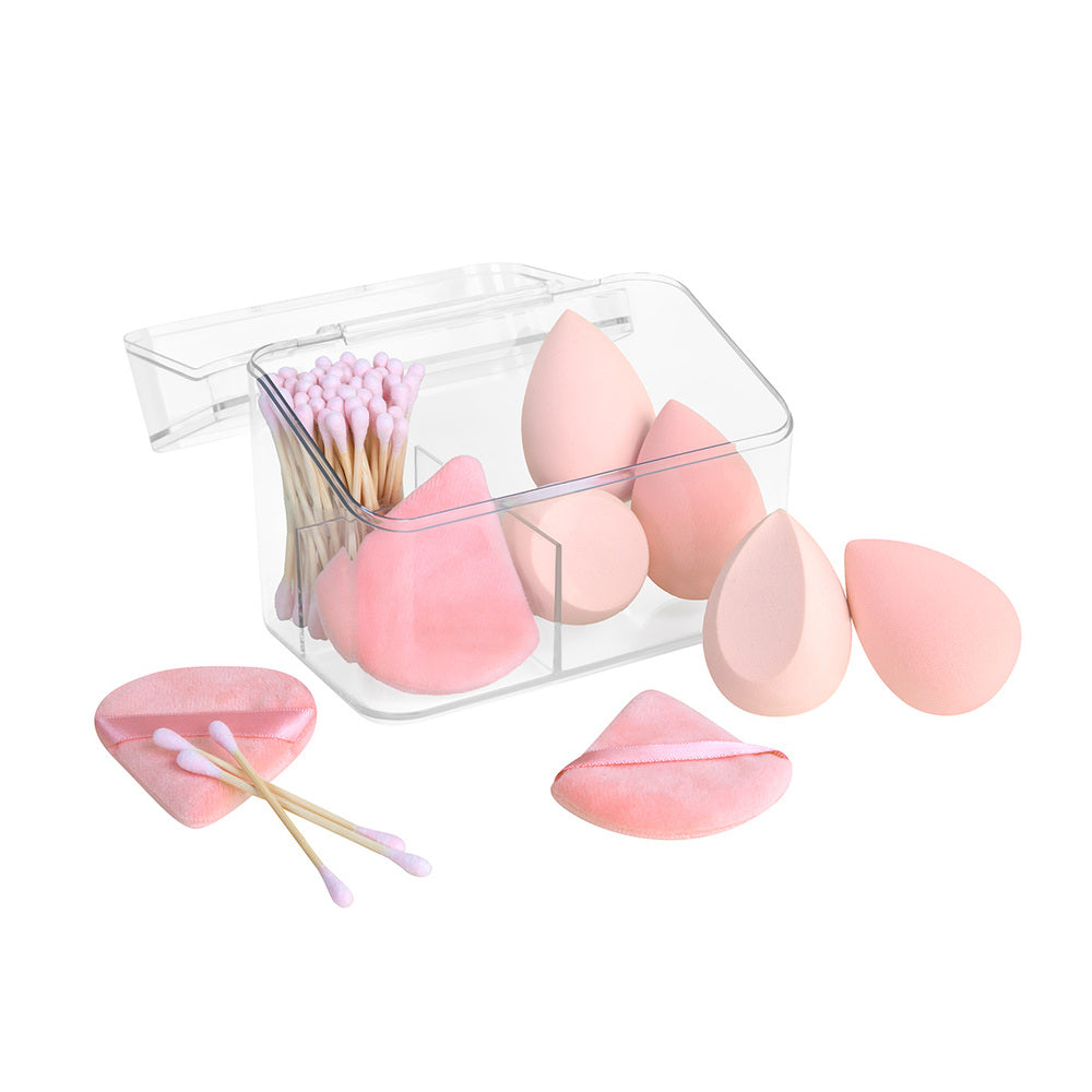 Estuche con set de aplicadores. Incluye 5 aplicadores de esponjas de latex perfectos para bases y correctores, 3 pufs de poliester para polvos que garantizan un acabado uniforme y profesional, y 50 cotonetes de madera ideales para detalles y retoques. Su estuche esta disenado para mantener todo organizado.