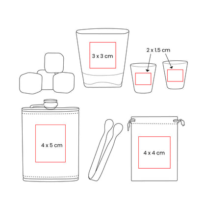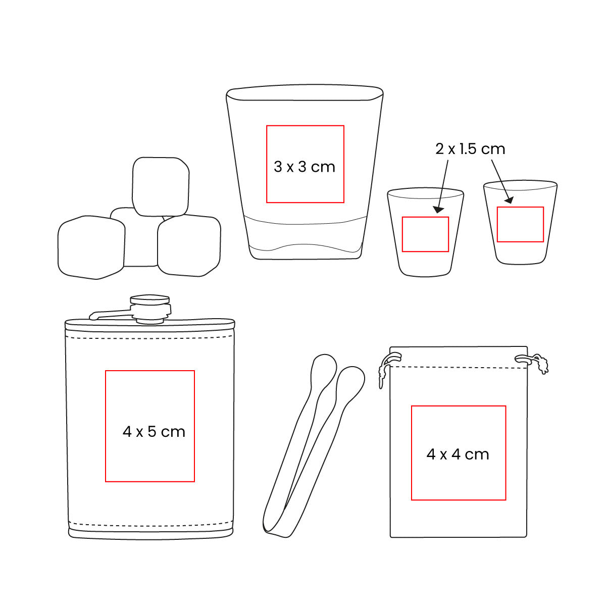 Área de impresión: 15 x 10 cm Caja / 4 x 5 cm Licorera / 3 x 3 cm Vaso / 2 x 1.5 cm Mini Vaso / 4 x 4 cm Bolsa Terciopelo