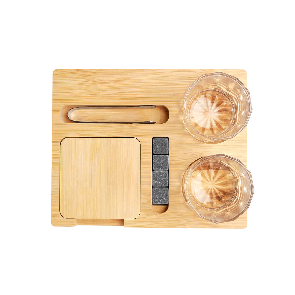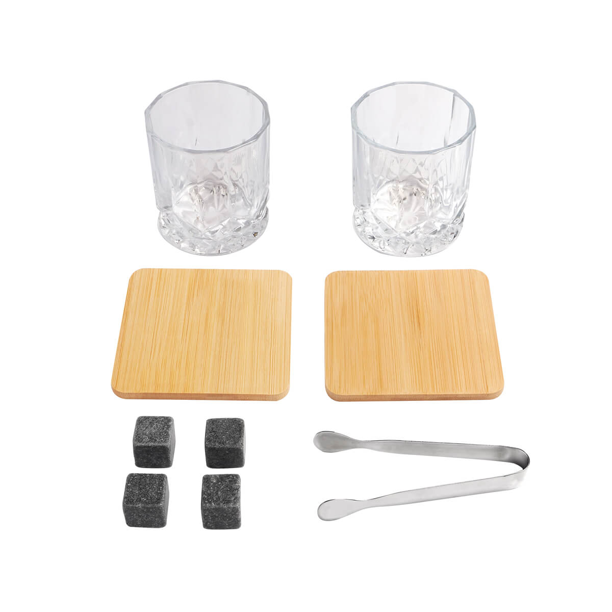 Set de bar con base de bambu. Incluye 2 vasos de cristal para whisky, 4 cubos enfriadores de granito, 2 portavasos de bambu y pinzas para hielo de acero inoxidable. Incluye caja individual.