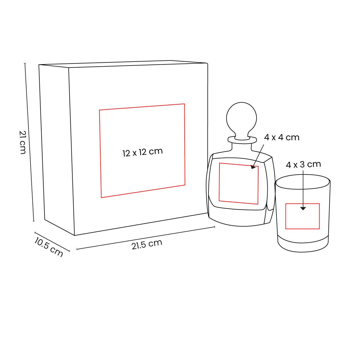 Área de impresión: 4 x 4 cm Licorera / 4 x 3 cm Vaso / 12 x 12 cm Caja