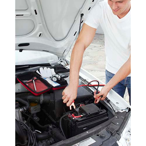 Contiene cables pasa corriente (100 amp), medidor de presion de aire (50 psi), guantes, impermeable, vendas adheribles para proteger heridas, pinza, estuche y lampara para cabeza con 7 LEDS, utiliza 3 baterias AAA (no incluidas).