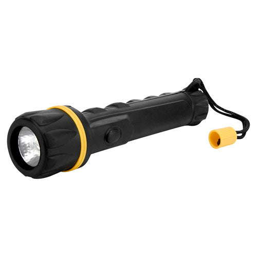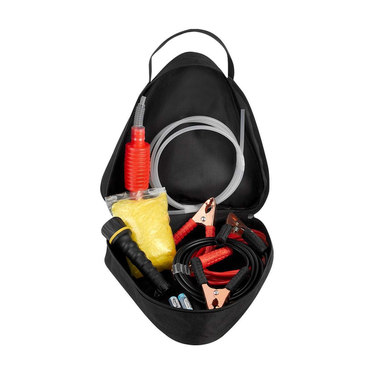Contiene cables pasa corriente, bomba manual para gasolina, linterna con 2 baterias AA (incluidas), poncho de plastico y funda con triangulo reflejante.
