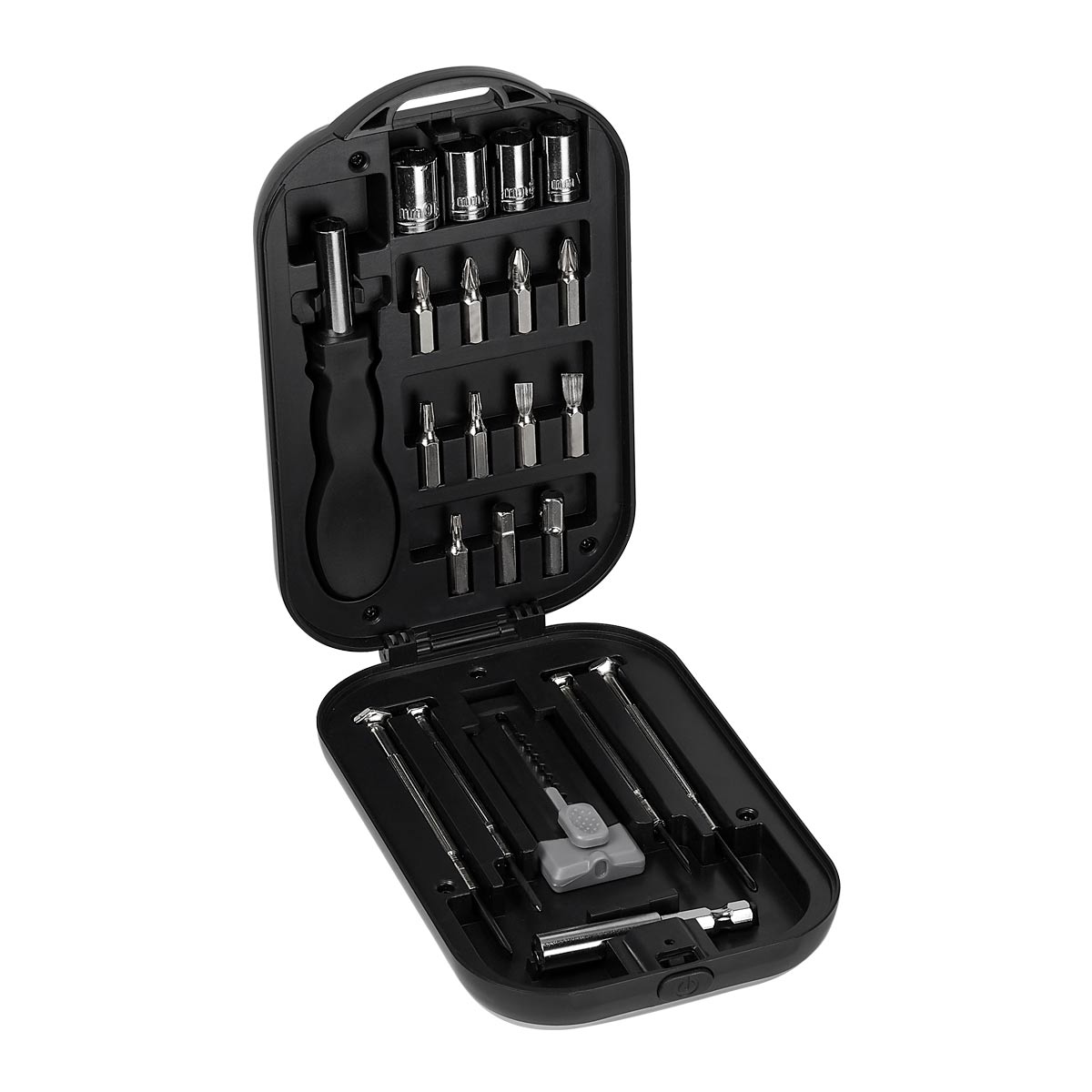 Contiene cuter, 4 desarmadores de relojero, dado extension, 4 dados, desarmador con 10 puntas diferentes e intercambiables. Incluye estuche.
