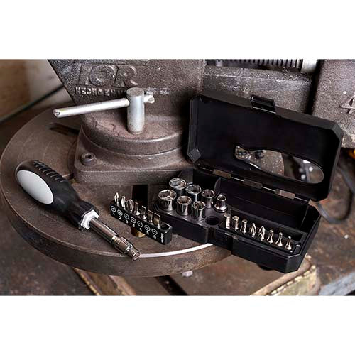 Contiene desarmador con 16 puntas y 8 dados diferentes e intercambiables. Incluye estuche.