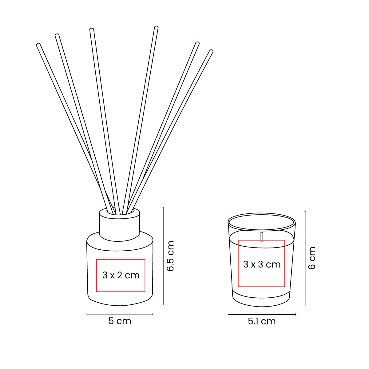 Área de impresión: 3 x 3 cm Vela / 3 x 2 cm Esencia