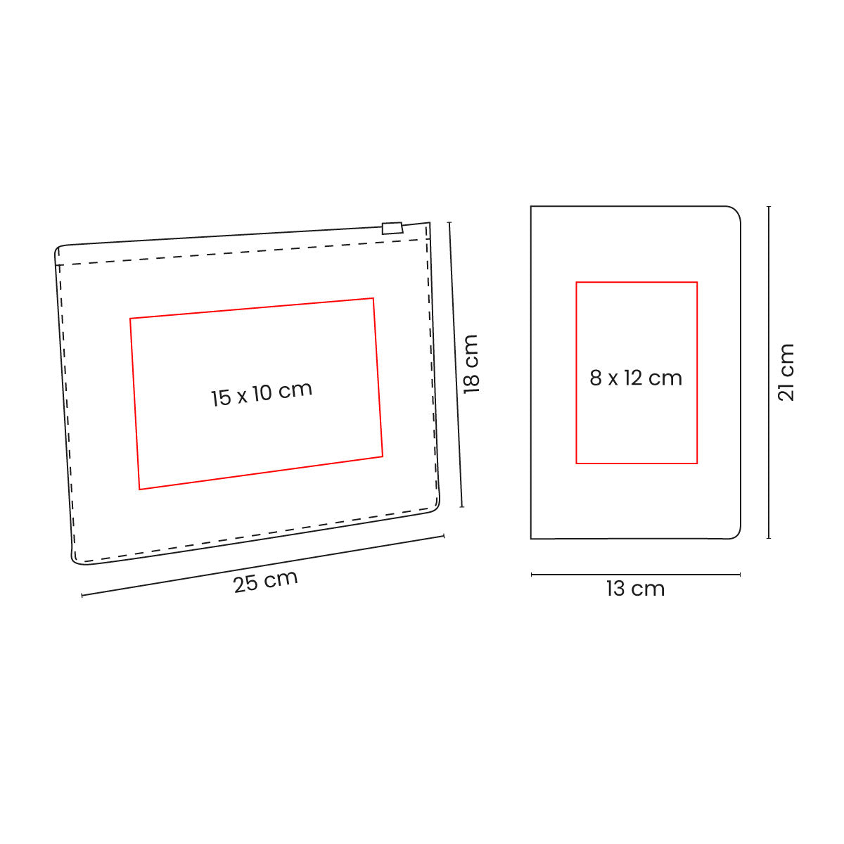 Área de impresión: 15 x 10 cm Bolsa / 8 x 12 cm Libreta