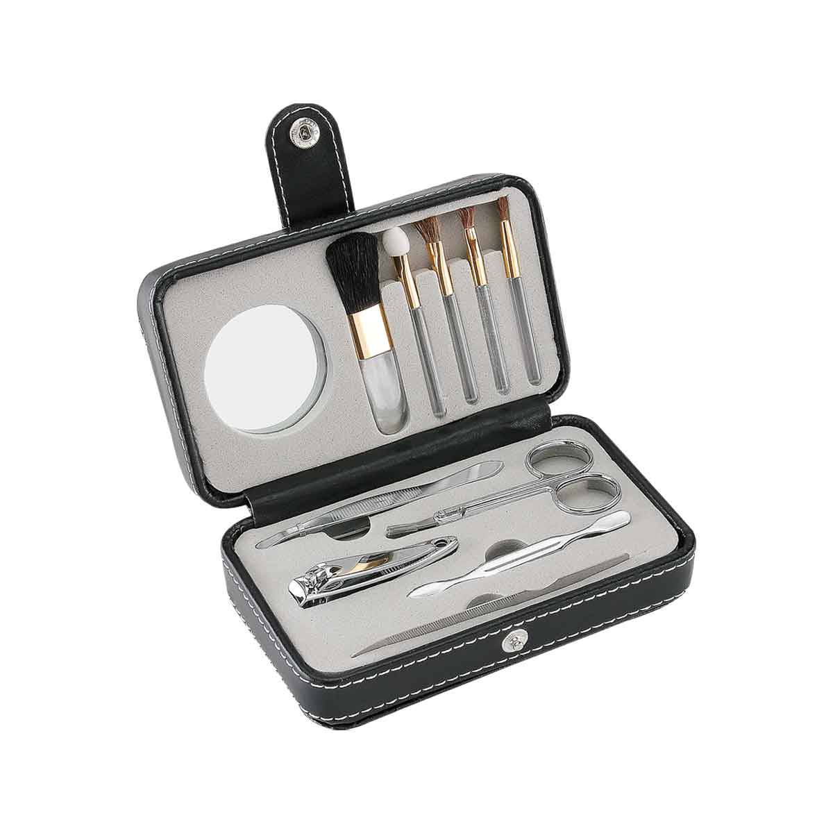 Set con 1 tijeras, 1 pinza para cejas, 1 cortaunas, 1 lima de unas, 1 empujador de cuticula, 1 brocha de rubor, 1 aplicador de sombra, 3 brochas para sombra y estuche con espejo. Los accesorios de manicure no son para uso profesional.