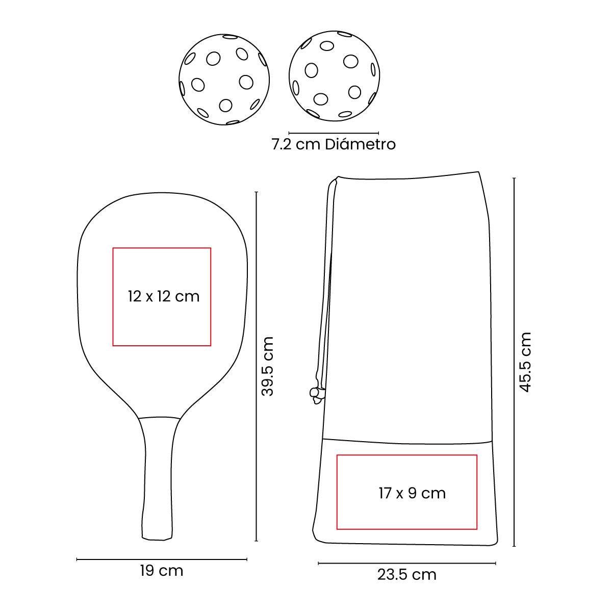 Medidas de producto: 19 x 39.5 cm Raqueta / 7.2 cm Diámetro Pelotas / 23.5 x 45.5 cm Bolsa