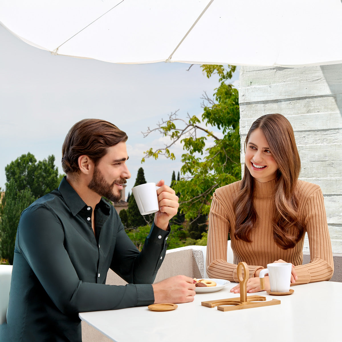 Juego de tazas. Incluye dos tazas de cerámica con asa de bambú, base de bambú con dos porta tazas y caja de regalo. No usar en microondas ni lavavajillas. El bambú es un producto natural el cual puede presentar variaciones en tonalidades y vetas.