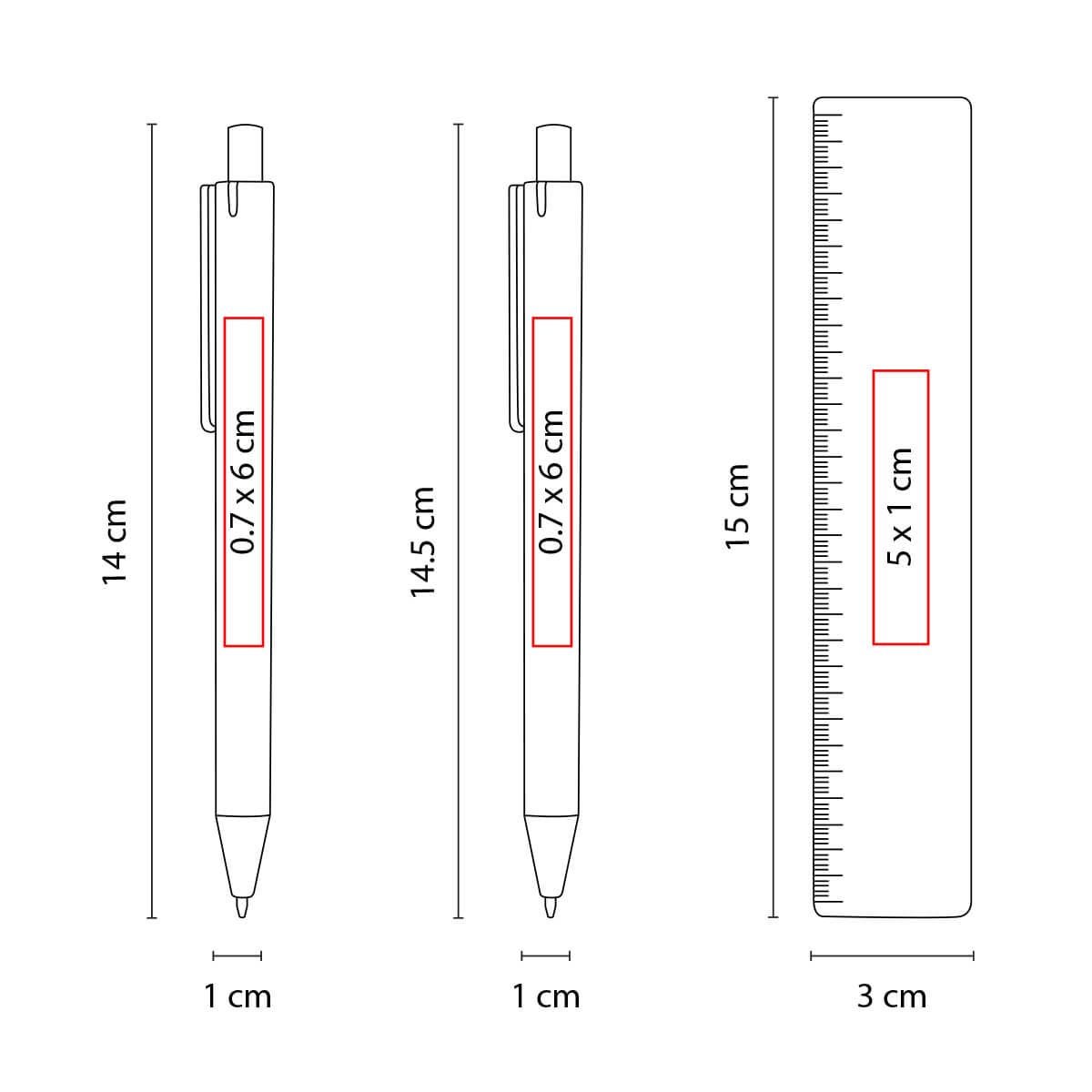 Área de impresión: 0.7 x 6 cm Bolígrafo / 0.7 x 6 cm Lapicera / 1 x 5 cm Regla