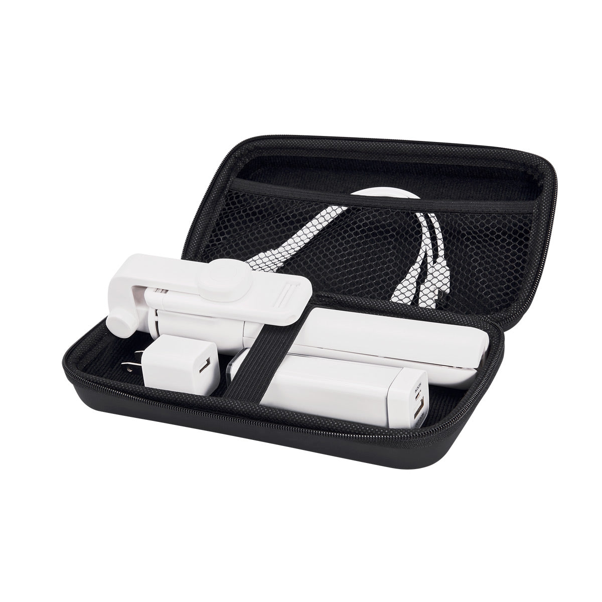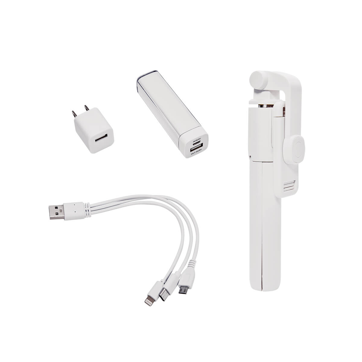 Incluye selfie stick inalambrico con bluetooth y control remoto para accionar la camara a distancia. Bateria auxiliar de 2,200 mAh, cargador de pared, cable cargador USB 3 en 1 (micro USB, tipo C y lightning) y estuche.