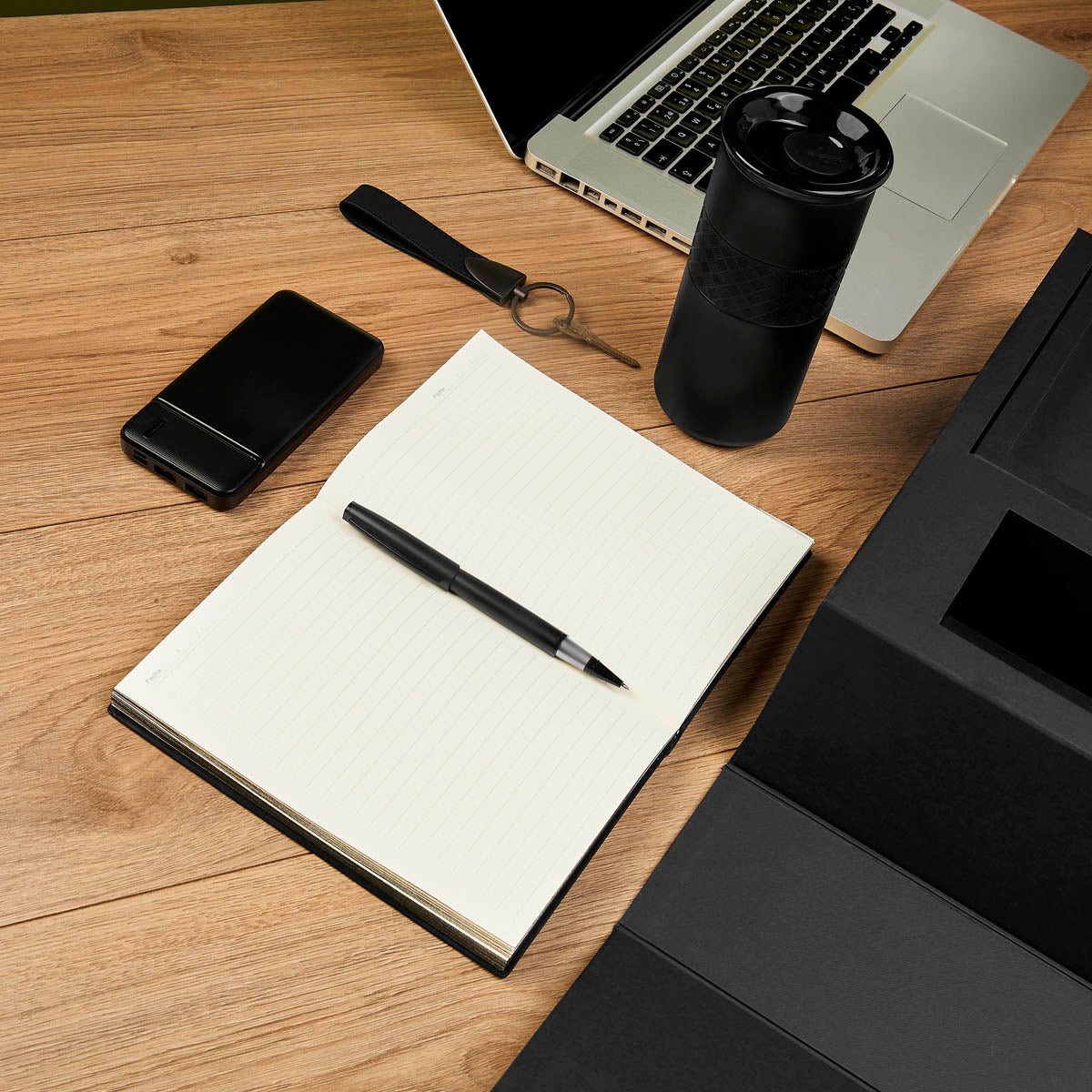 Exclusivo set de regalo. Presentado en una sofisticada caja con cierre imantado, este set no solo ofrece practicidad sino tambien un toque de lujo. La caja, decorada con un diseno sesgado moderno, refleja un estilo contemporaneo y asegura que su contenido se mantenga seguro y bien presentado. Incluye termo metalico de doble pared, cerrado al vacio y tapa de ceramica, adicional integra la tecnologia TrueBarrier de triple pared que ayuda a mantener tus bebidas calientes por mas tiempo. Libreta con 100 hojas de rayas y pasta de curpiel texturizado. Boligrafo metalico roller ball con tapon, tinta en color negro. Llavero metalico combinado con curpiel, aro con giro de 360°. Bateria auxiliar para smartphone de 10,000 mAh, incluye 2 puertos USB, 1 micro USB y 4 LEDs indicadores de carga.