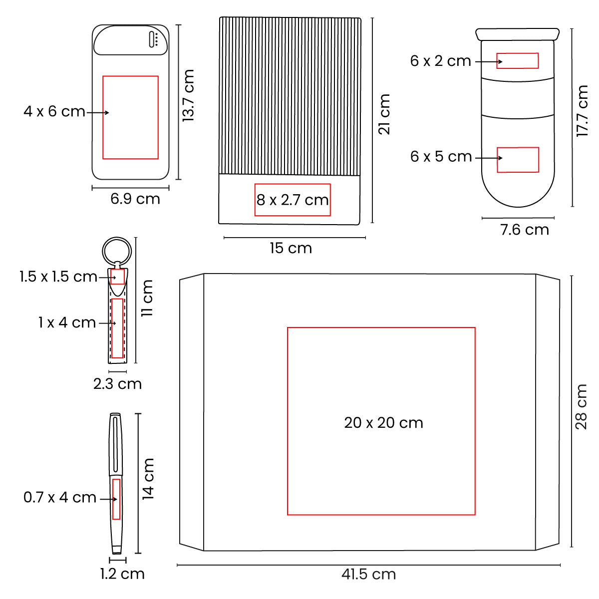 Área de impresión: 20 x 20 cm Caja / 5 x 3 cm Termo / 8 x 4 cm Libreta / 0.7 x 4 cm Bolígrafo / 4 x 6 cm Power Bank / 1 x 4 cm Curpiel / 1.5 x 1.5 cm Metal Llavero