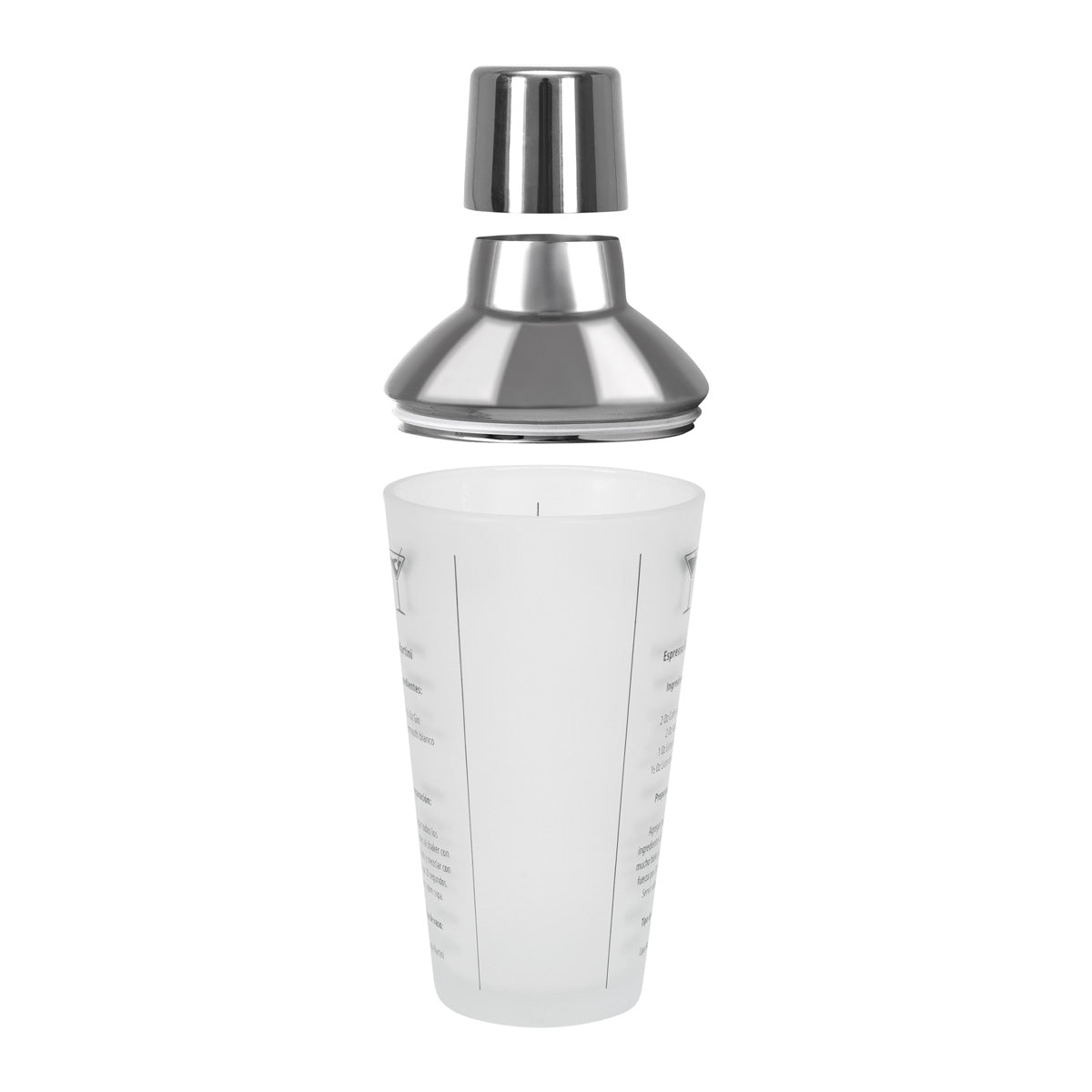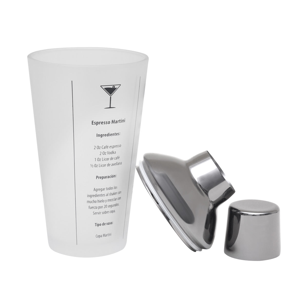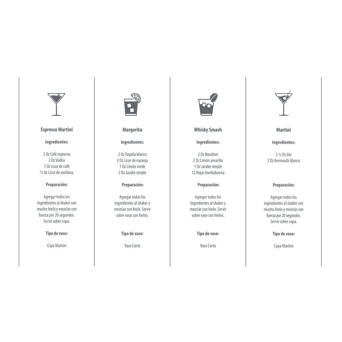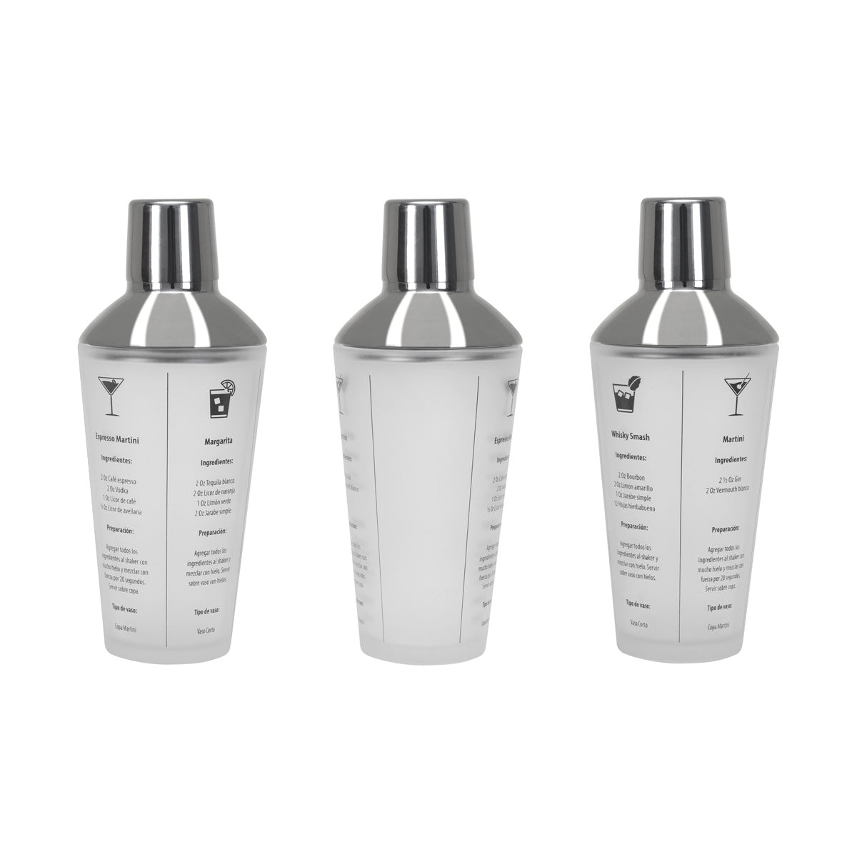 Shaker de cristal con 4 recetas incluidas. Conviertete en el barman perfecto con este shaker disenado para facilitar la preparacion de cocteles profesionales en casa, guiandote paso a paso para crear bebidas como un experto. Podras preparar un expresso martini, margarita, whisky smash o martini. Incluye caja individual.