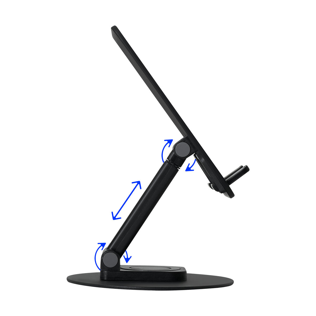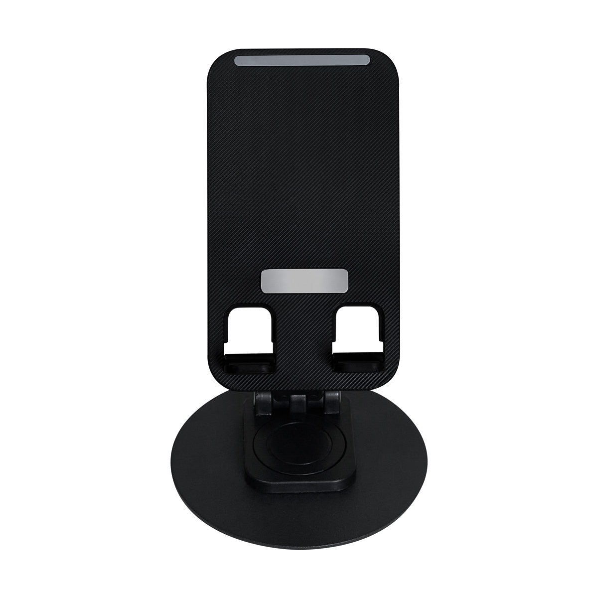 Soporte universal con diseno plegable. Incluye una base giratoria de 360° que permite un facil ajuste y personalizacion, lo que garantiza un angulo de vision comodo para el usuario. Desplegable a una altura maxima de 20 cm. Incluye caja individual.