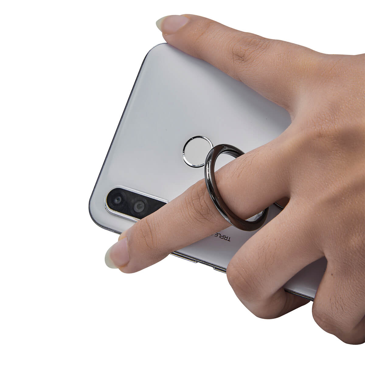 Anillo para smartphone con giro 360°, la base gira 180° para ajustar la vision horizontal o vertical. Incluye adhesivo para pegar directamente sobre el dispositivo (no apto sobre superficies rugosas o impermeables).