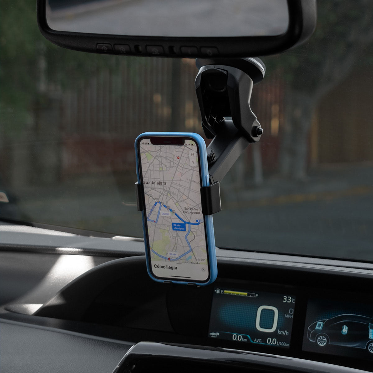Soporte plegable con ventosa de gel que se adhiere firmemente a tableros y parabrisas. Altura e inclinación ajustable. Incluye caja individual.