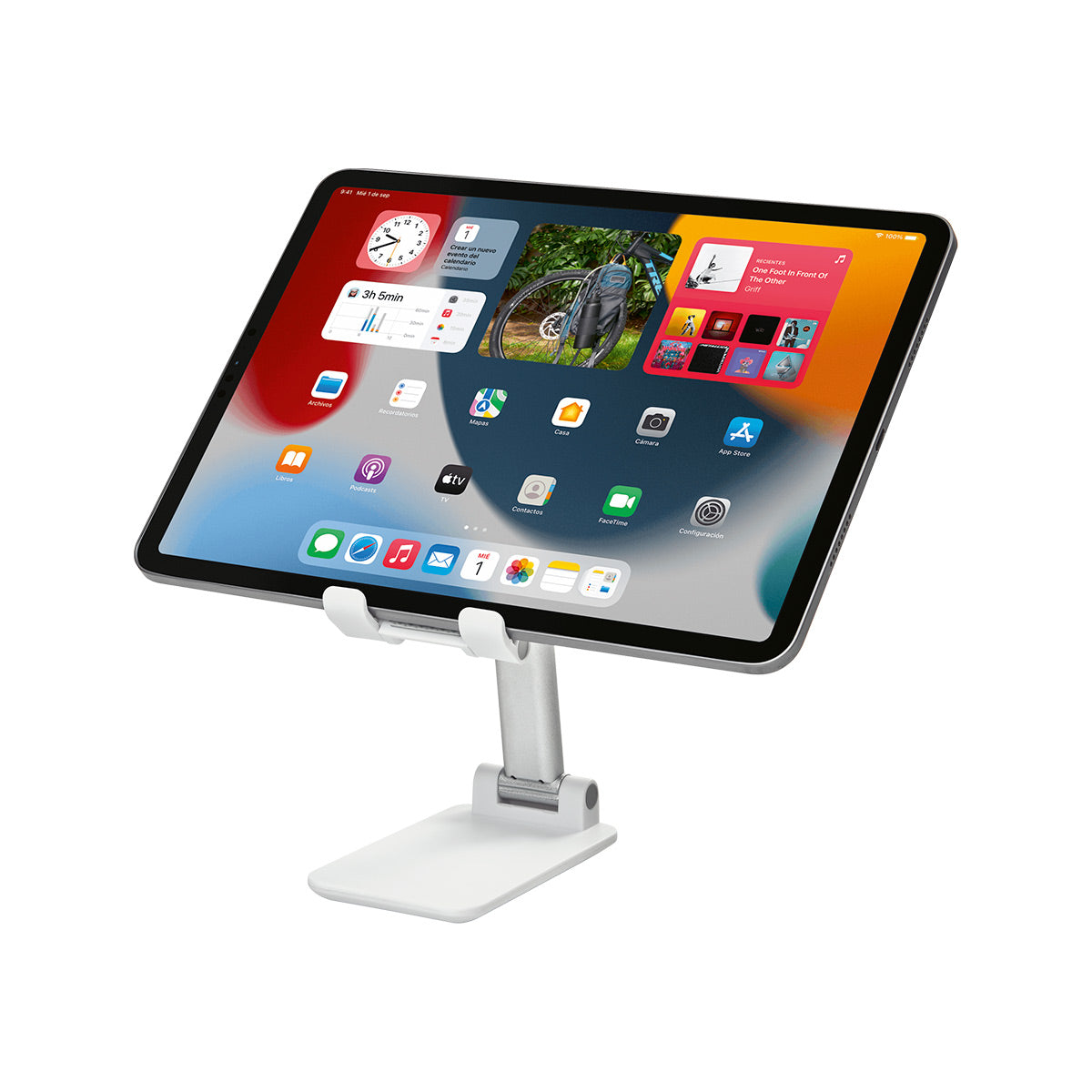 Soporte plegable. Soporte y base con material antiderrapante. Altura e inclinacion ajustable. Desplegable a una altura maxima de 16 cm.