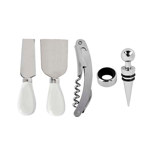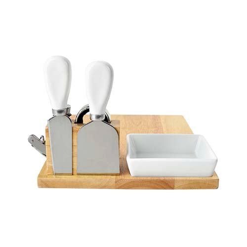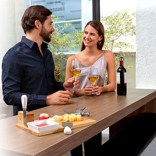Set de madera con 1 tabla con base imantada, 2 cuchillos para quesos, 1 plato, 1 sacacorchos con navaja, 1 stopper y 1 arillo. La madera es un producto natural el cual puede presentar variaciones en tonalidades y vetas.