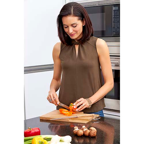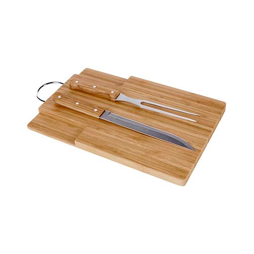 Tabla de cocina. Incluye tenedor y cuchillo. Incluye caja individual. La madera es un producto natural el cual puede presentar variaciones en tonalidades y vetas. Este producto por ser últimas piezas puede presentar alguna variación, no se aceptan devoluciones.