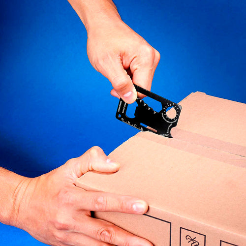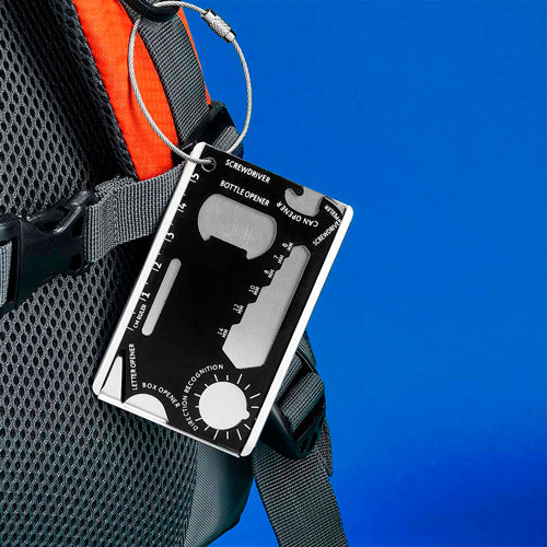 Tarjeta multiherramientas con función de desarmador, abrecartas, abrelatas, destapador, llave inglesa, regla y pelador. Incluye aro para llavero.