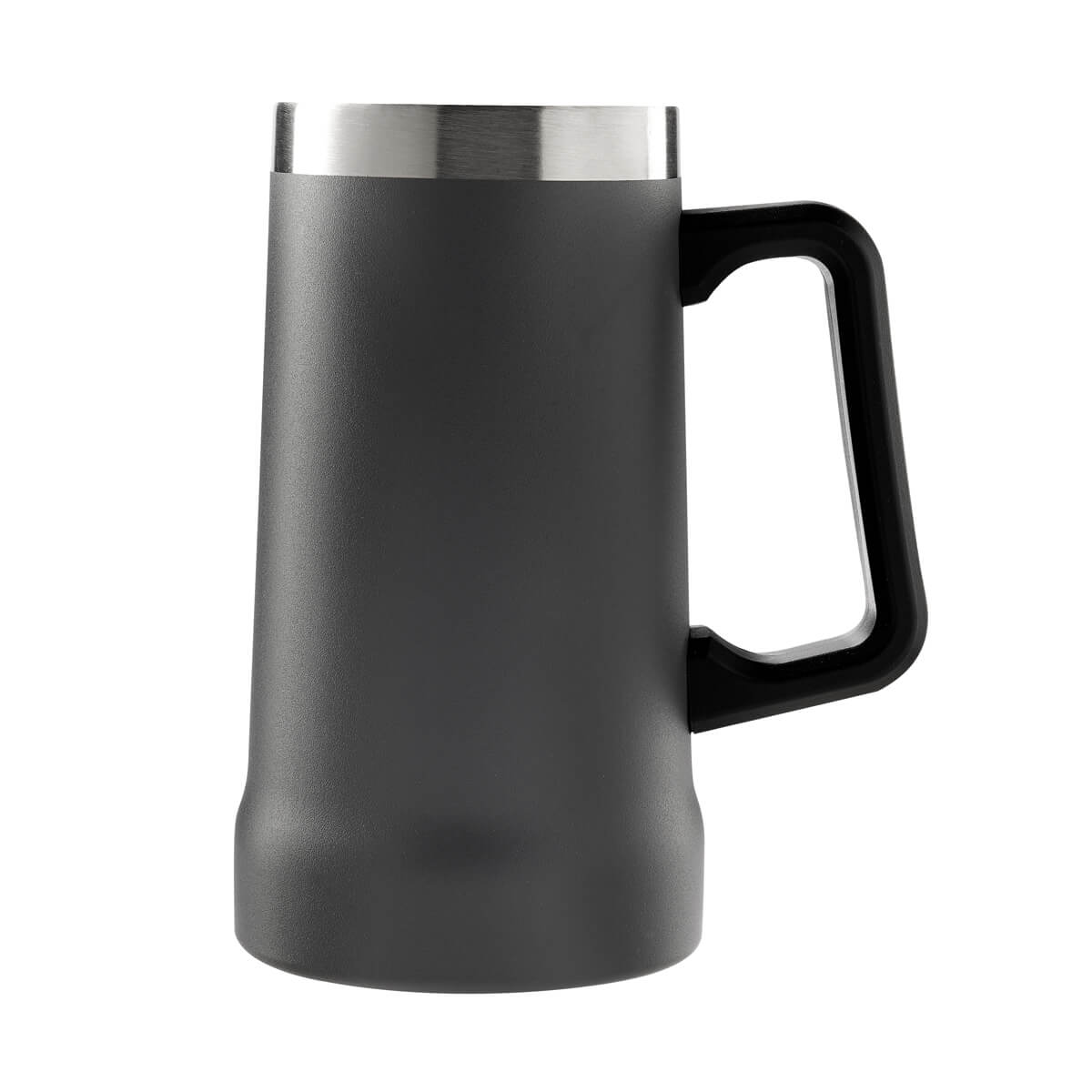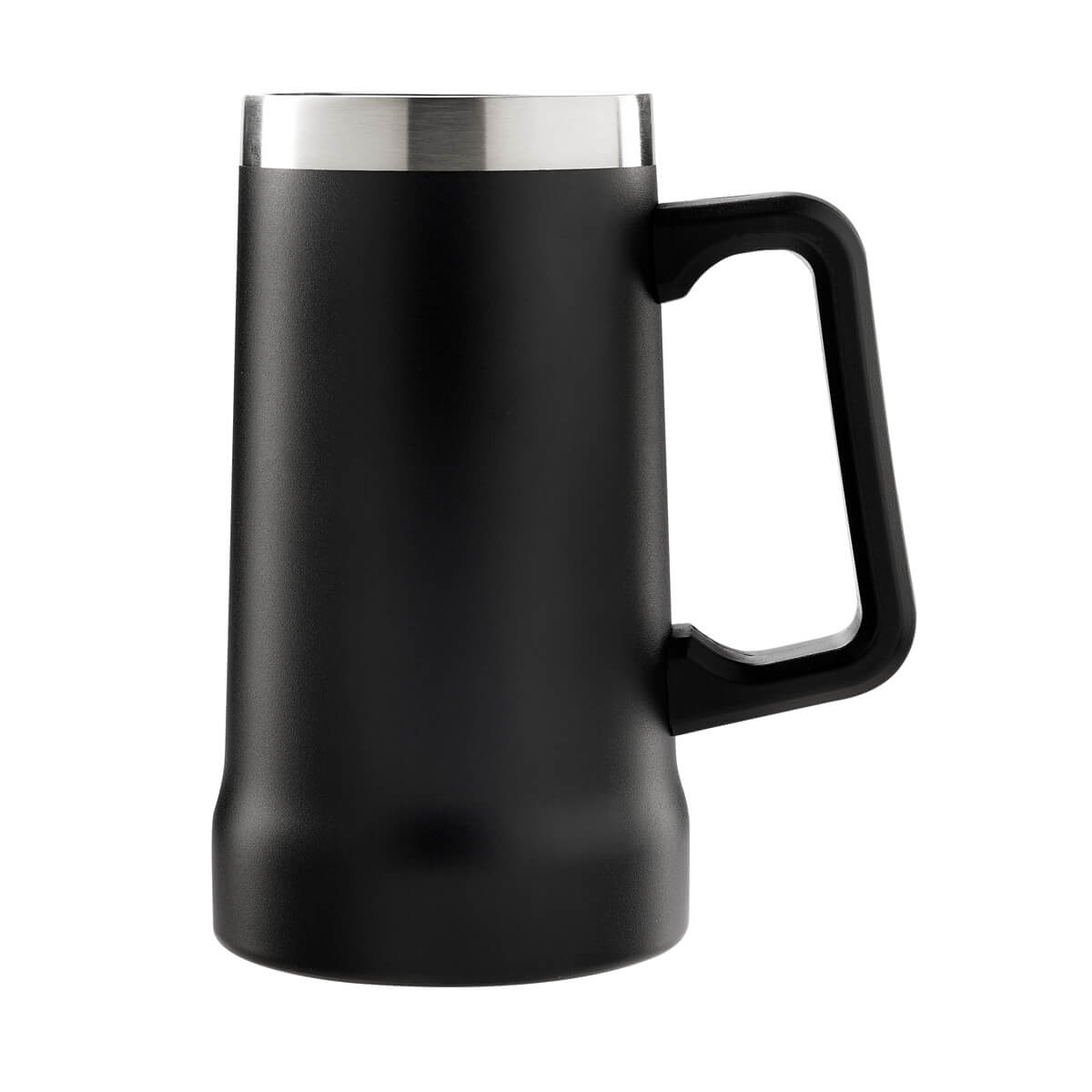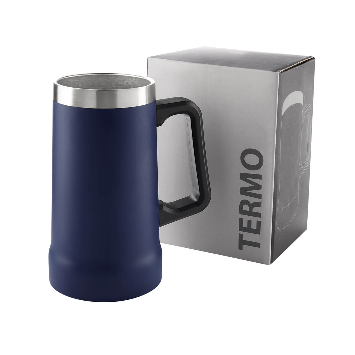 Tarro para bebidas frias o calientes. Aislamiento al vacio. Acero inoxidable de doble pared. Terminado rugoso. Incluye asa amplia de plastico y caja individual.