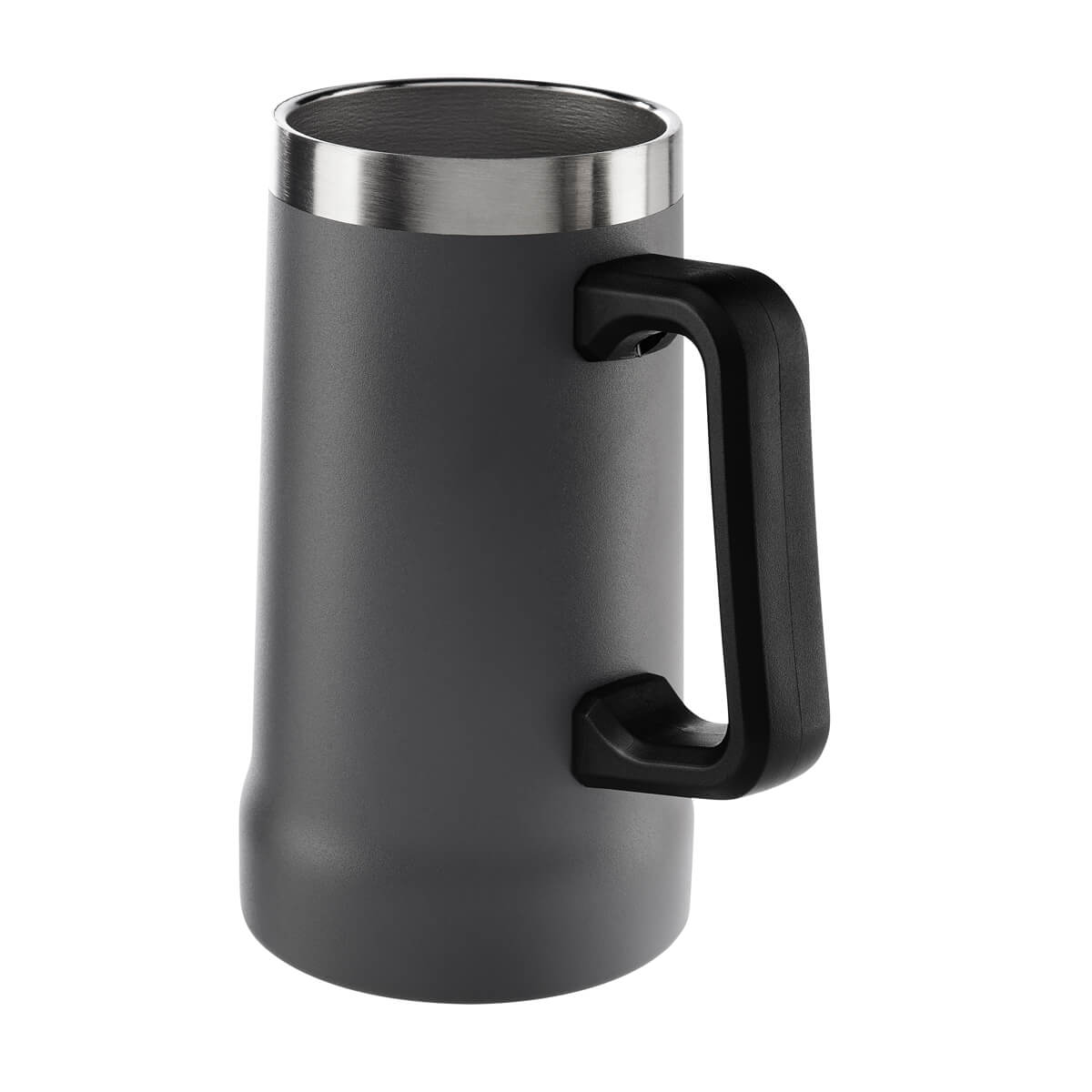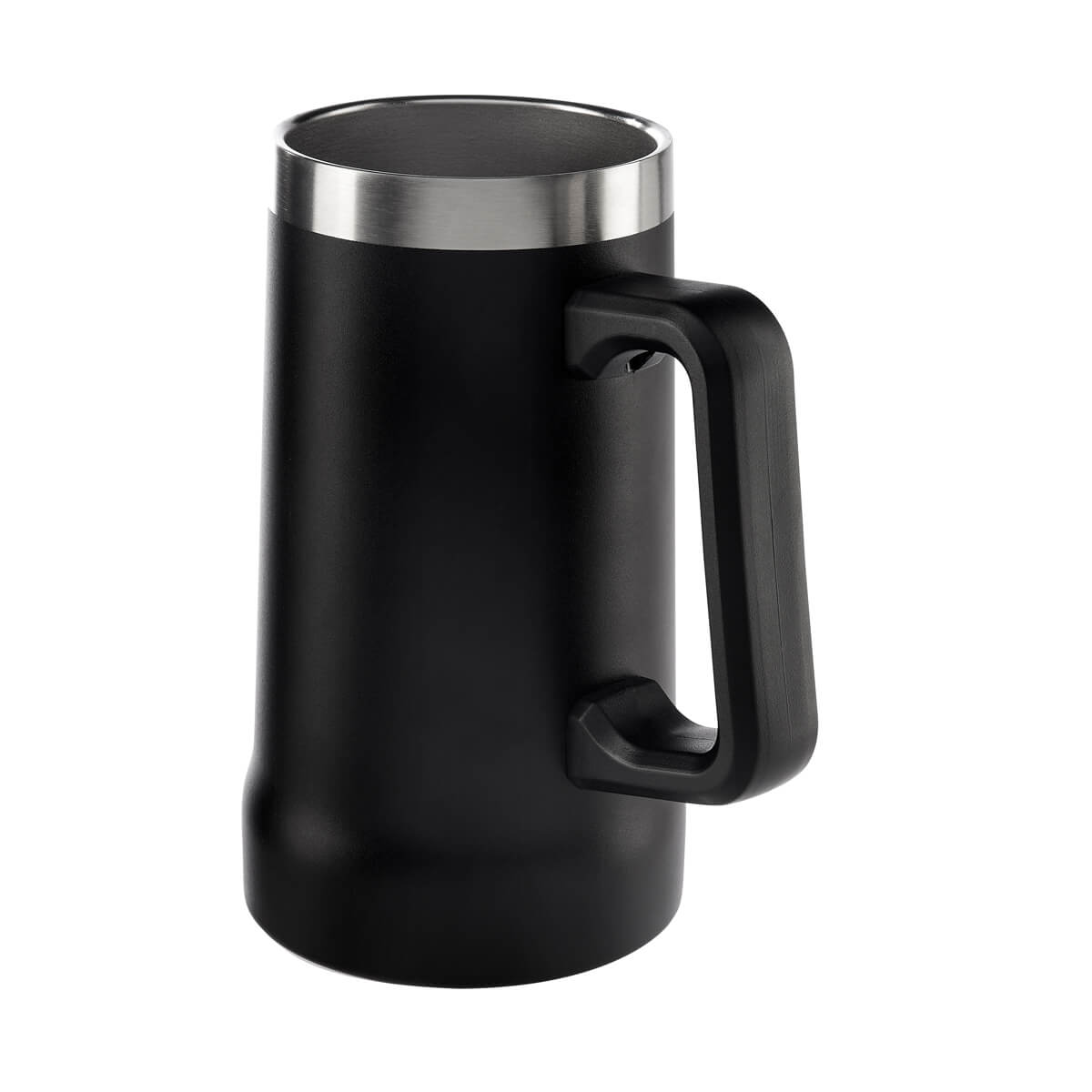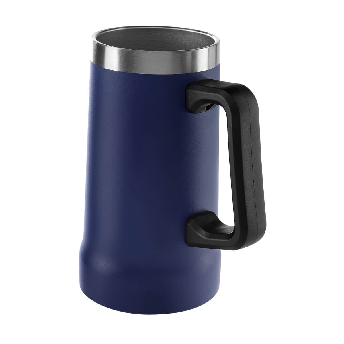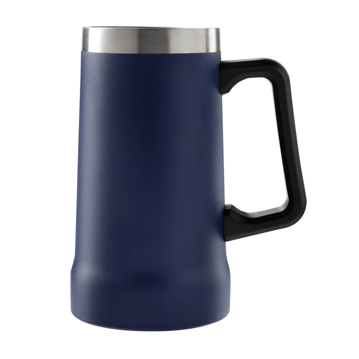 Tarro para bebidas frias o calientes. Aislamiento al vacio. Acero inoxidable de doble pared. Terminado rugoso. Incluye asa amplia de plastico y caja individual.