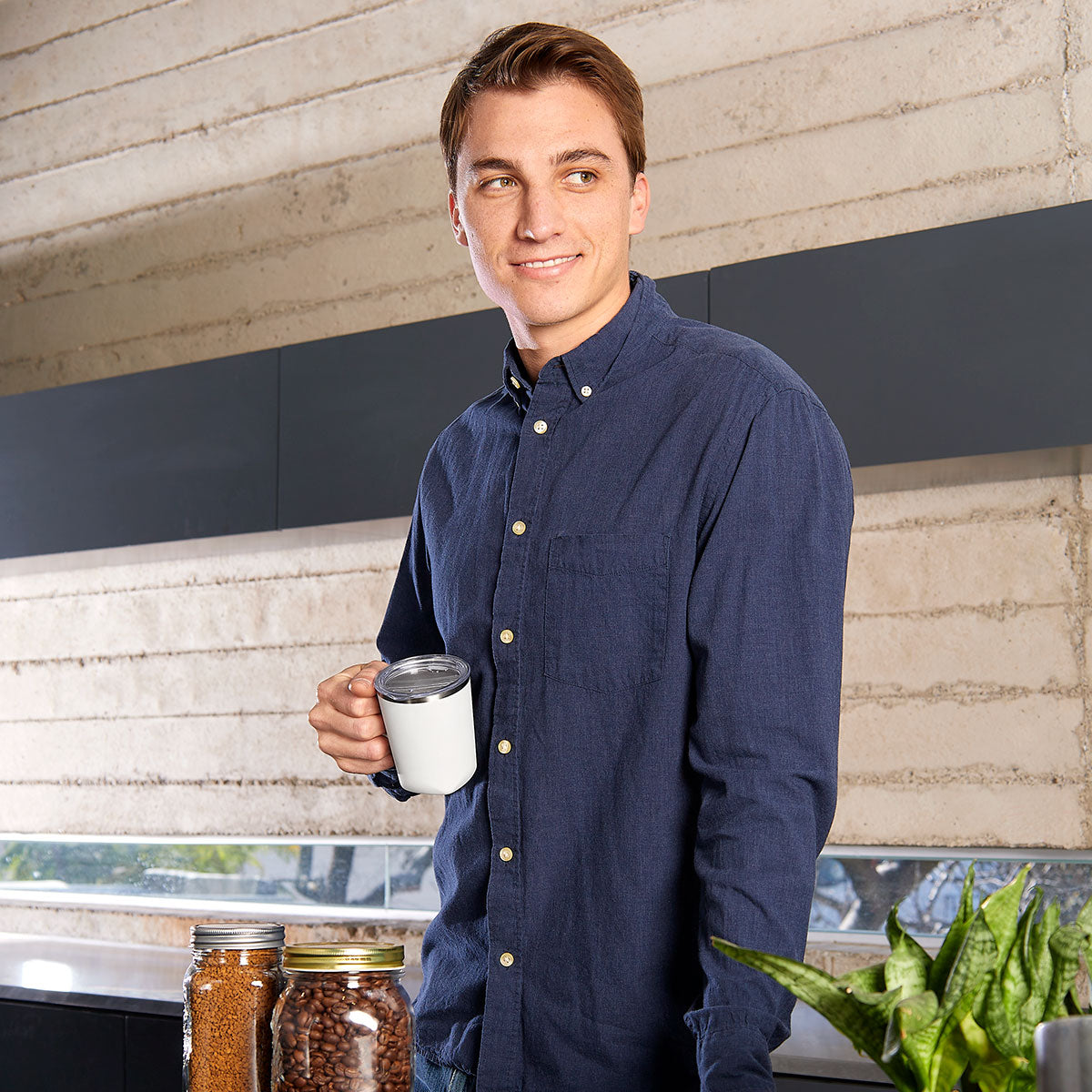Doble pared. Cerrado al vacio. Pared interna y externa de acero inoxidable. Tapa de plastico con ranura. Incluye caja individual.