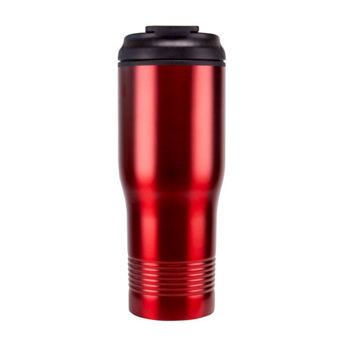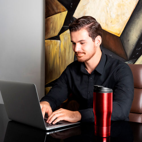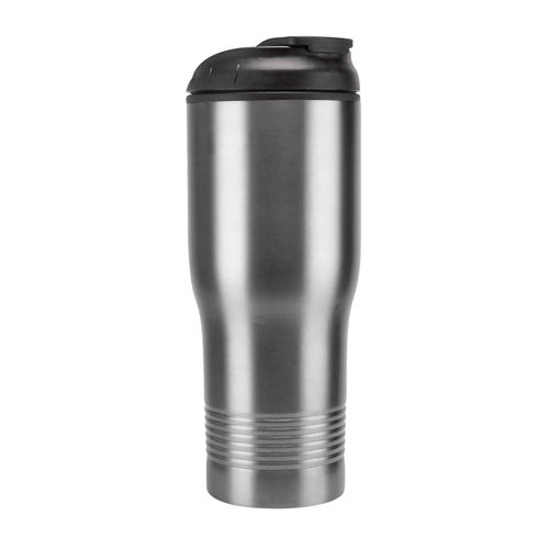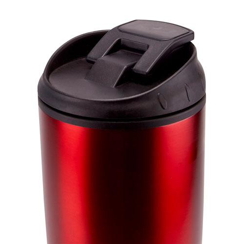 Doble pared. Pared interna plastico, pared externa acero inoxidable. Tapa de plastico con boquilla y sobre tapa de cierre a presion. Incluye caja individual.
