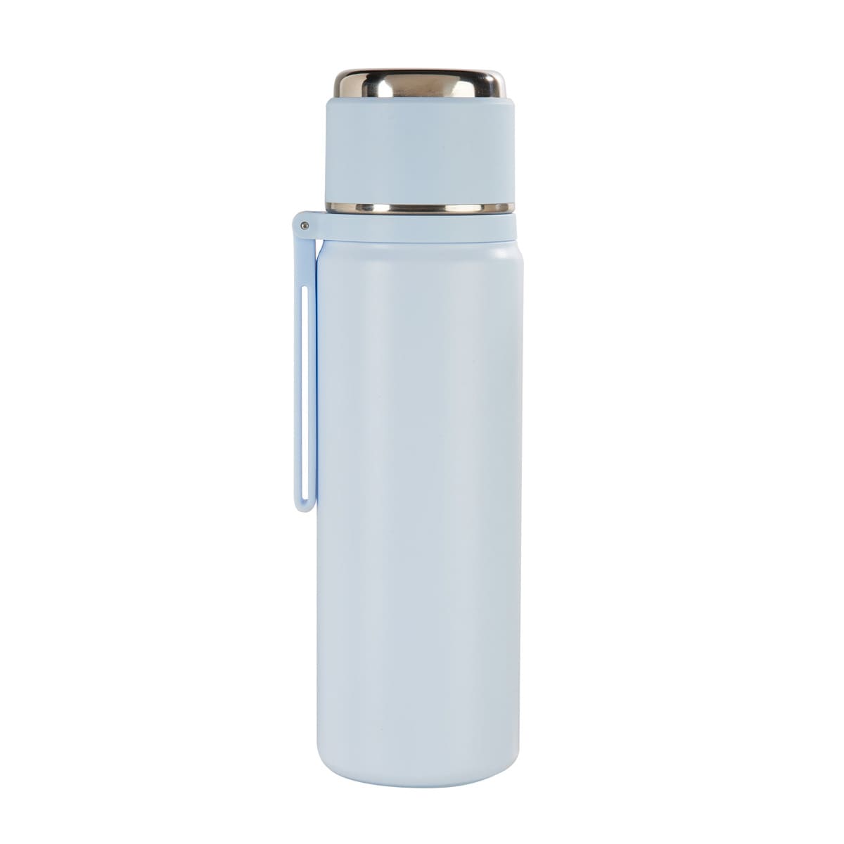 Termo doble pared. Cerrado al vacio. Pared interna y externa acero inoxidable. Tapa de plastico con sistema de rosca, boquilla y boton de seguridad para mantener cerrado y sin derrames, incluye sobretapa metalica de rosca. Cuenta con un asa de silicon para llevarlo facilmente a donde quiera que vayas. Mantiene la temperatura caliente por 12 hrs y la temperatura fria por 24 hrs. Capacidad de 17 Oz. Incluye caja individual.