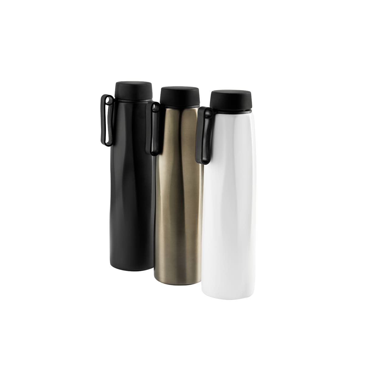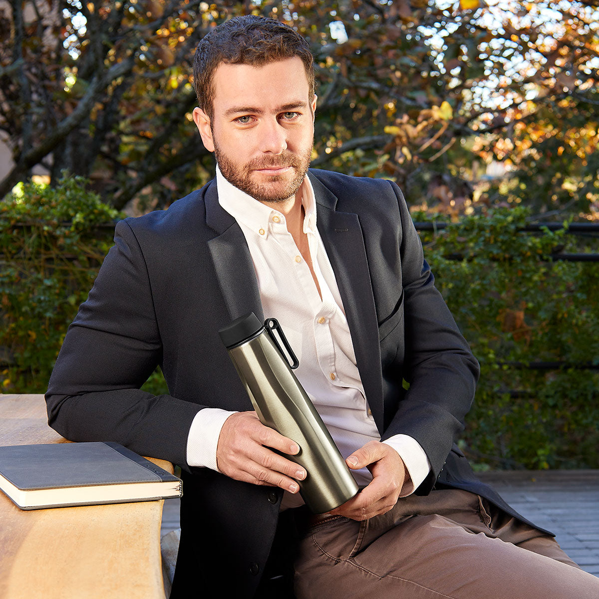 Doble pared. Cerrado al vacio. Pared interna y externa acero inoxidable. Tapa de rosca con terminado rubber para grabado efecto espejo. Incluye asa y caja individual.