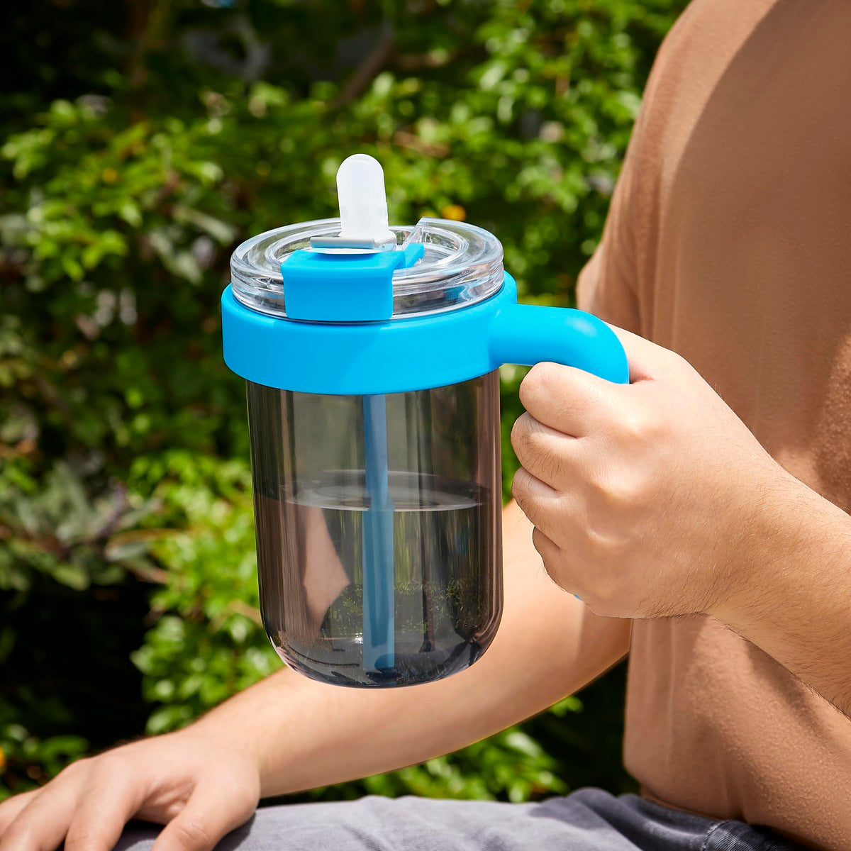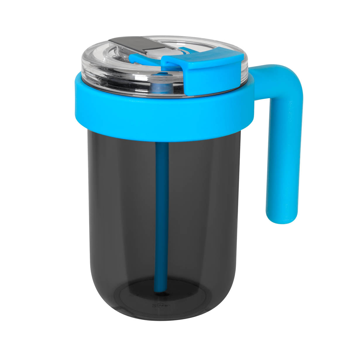 Termo de plastico de una pared. Tapa de plastico con sistema de rosca, sobre tapa con sistema de push y boquilla plegable con popote integrado. Es facil de usar y perfecto para llevar en cualquier actividad. Su asa grande y ergonomica, permite un agarre mas comodo. Su combinacion de colores, con un cuerpo oscuro translucido y acentos en color solido en el asa, popote y tapa, le da un toque moderno y atractivo. Incluye caja individual.