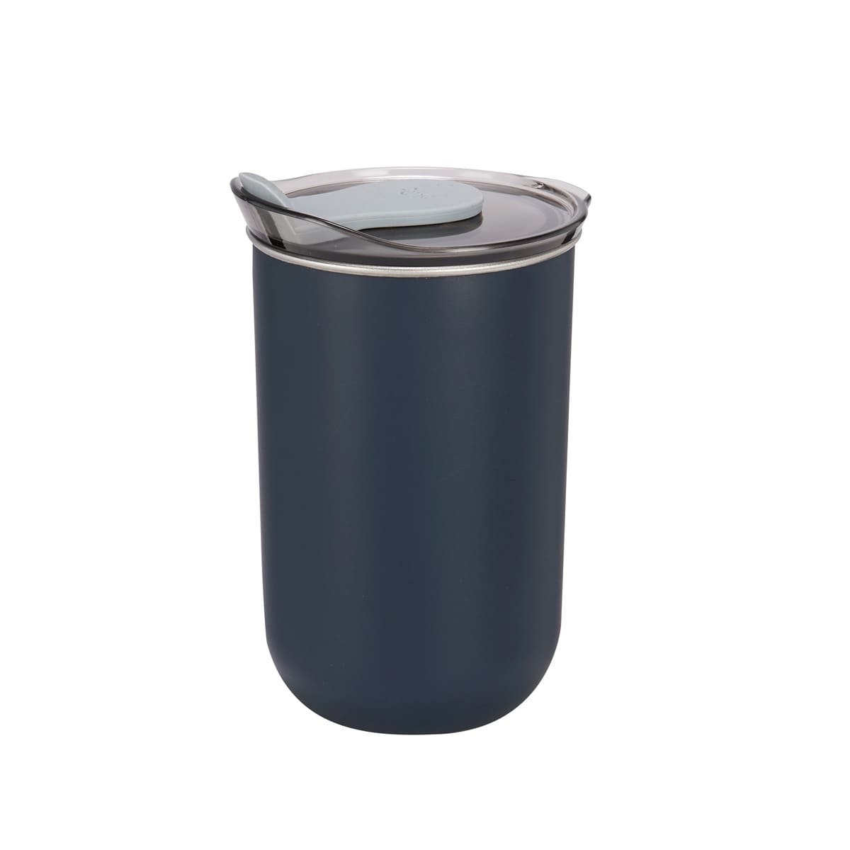 Doble pared. Pared interna de acero inoxidable y externa de plastico. Tapa de plastico con sistema push y sobretapa de silicon movible. Incluye caja individual.
