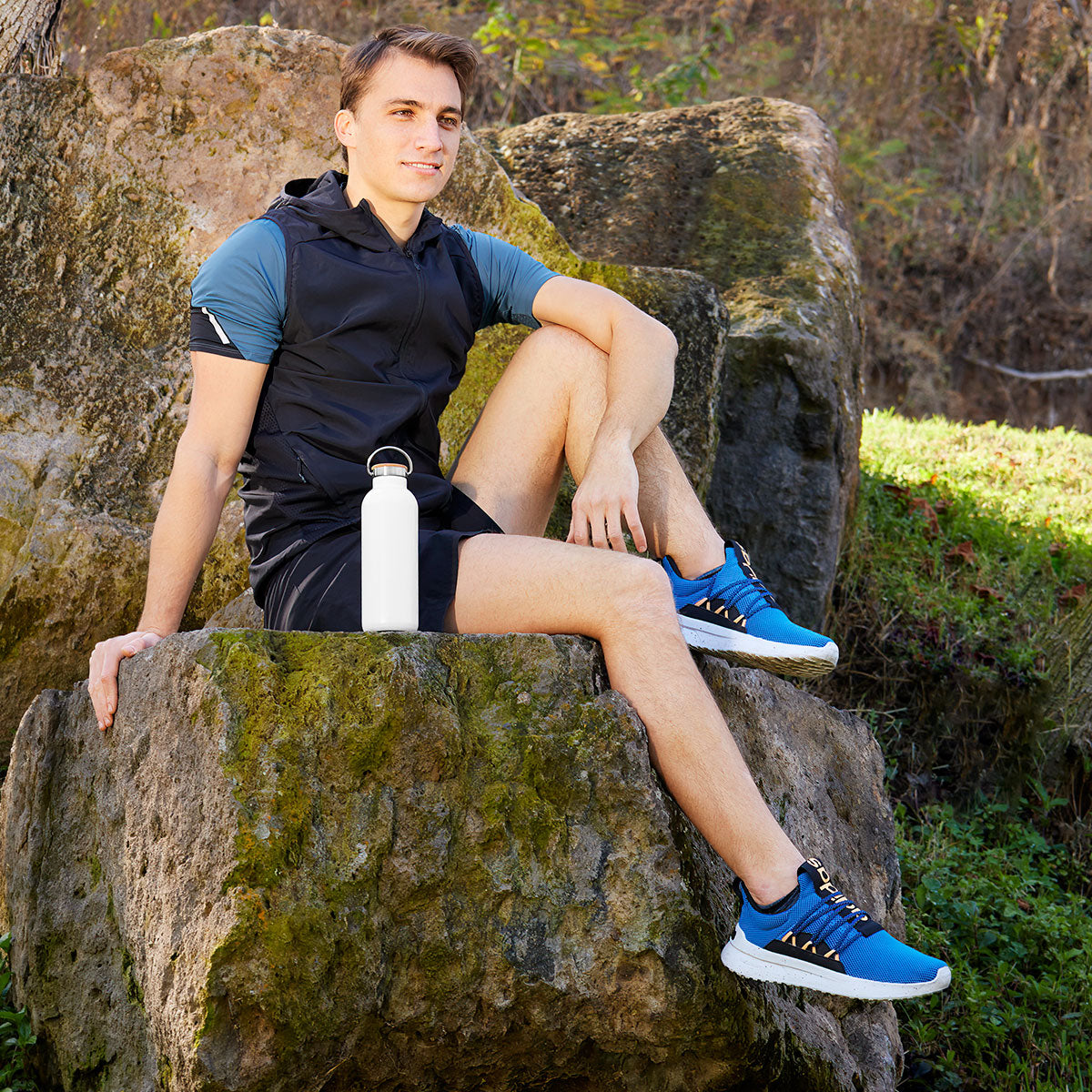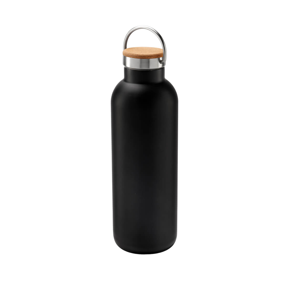 Doble pared. Cerrado al vacio. Pared interna y externa de acero inoxidable. Tapa con sistema de rosca de acero inoxidable con corcho y asa metalica. Mantiene temperatura caliente 6 hrs y temperatura fria 12 hrs. Incluye caja individual.