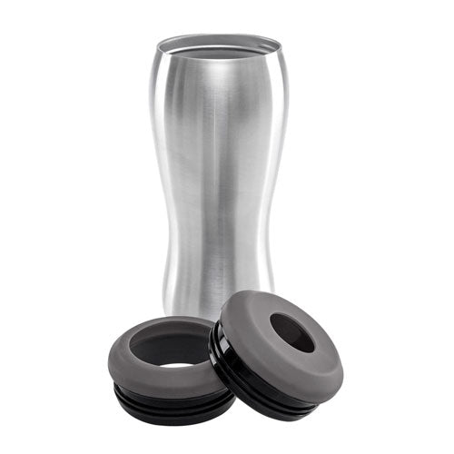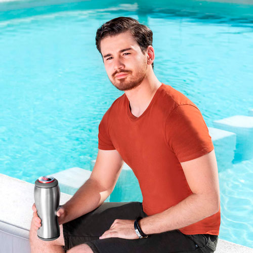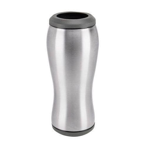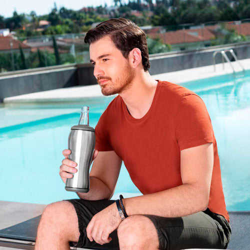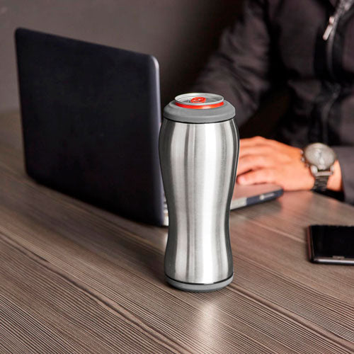 Doble pared. Pared interna y externa acero inoxidable. Tapas intercambiables para lata o botella. Mantiene la bebida fria. Incluye caja individual.