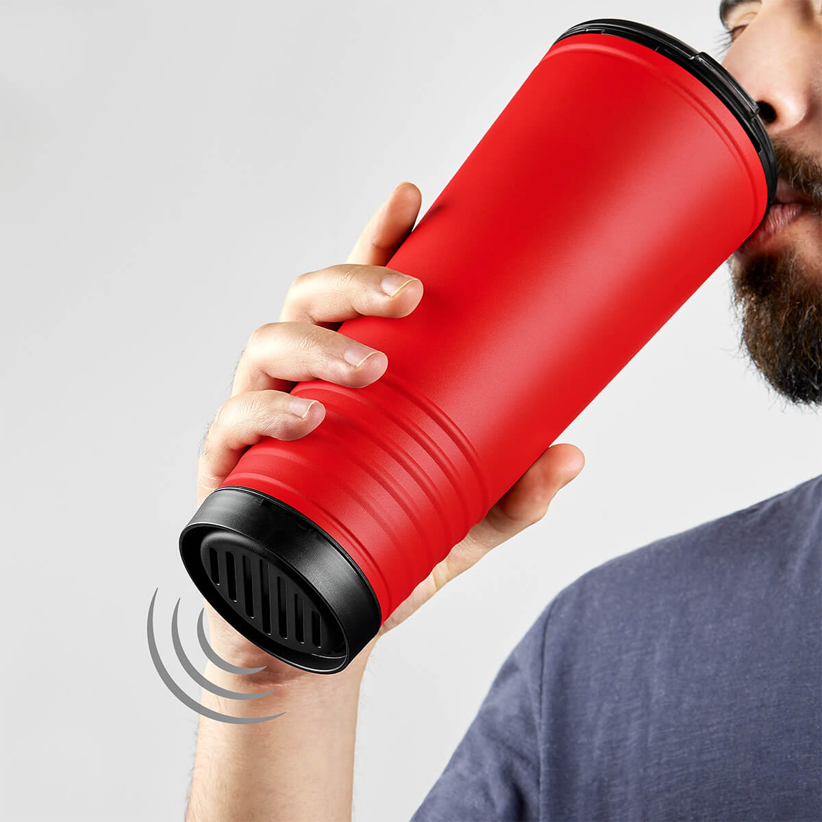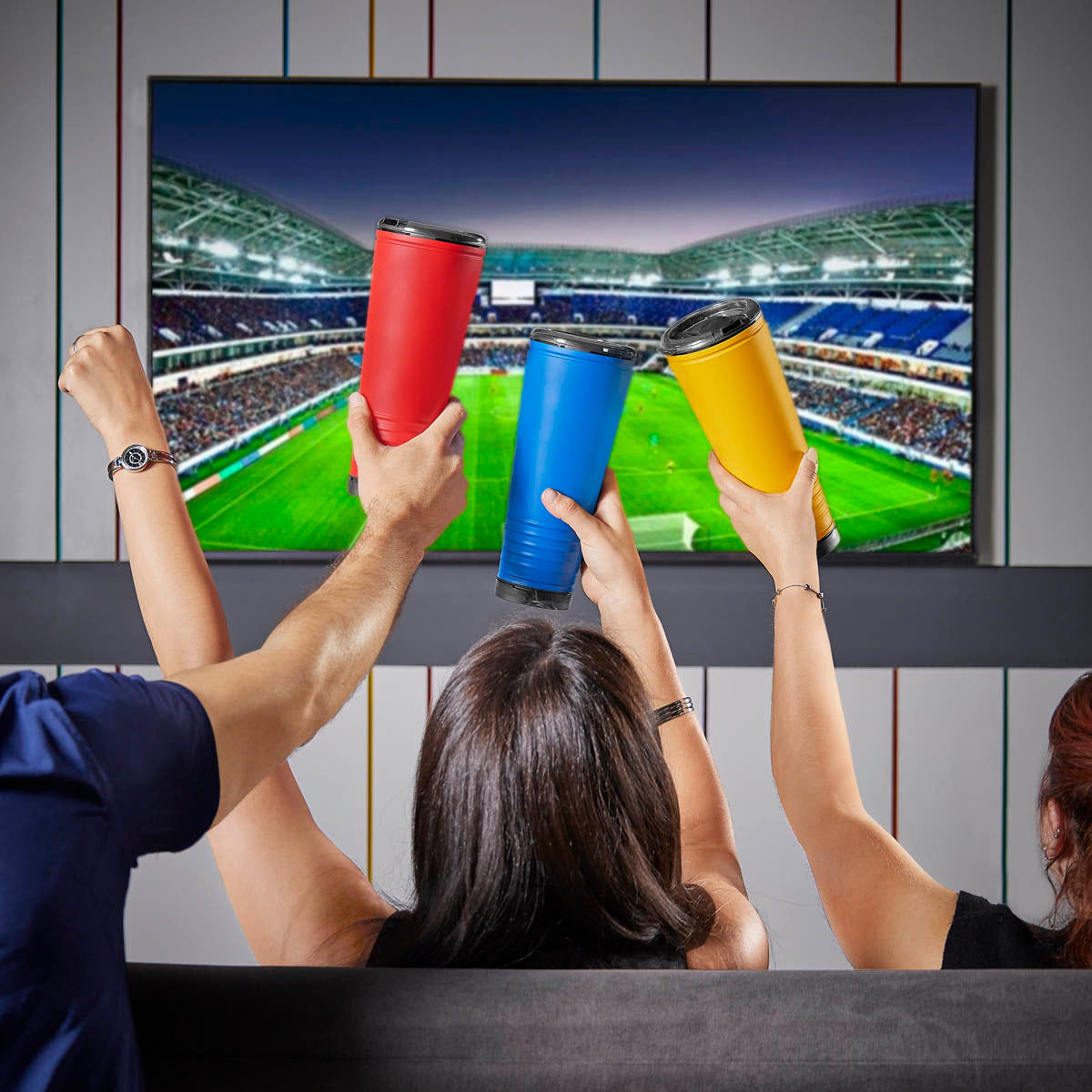 ¡Lleva la emocion de los eventos deportivos al siguiente nivel! Termo equipado con una boquilla especial en la tapa que realiza una doble funcion; como trompeta, para animar tu evento favorito y al mismo tiempo, disfrutar de tu bebida preferida. Termo doble pared. Pared interna de plastico y externa de acero inoxidable. Tapa de plastico con sistema push y valvula de seguridad. Capacidad de 24 Oz. Base de 7 cm de diametro. Incluye caja individual.