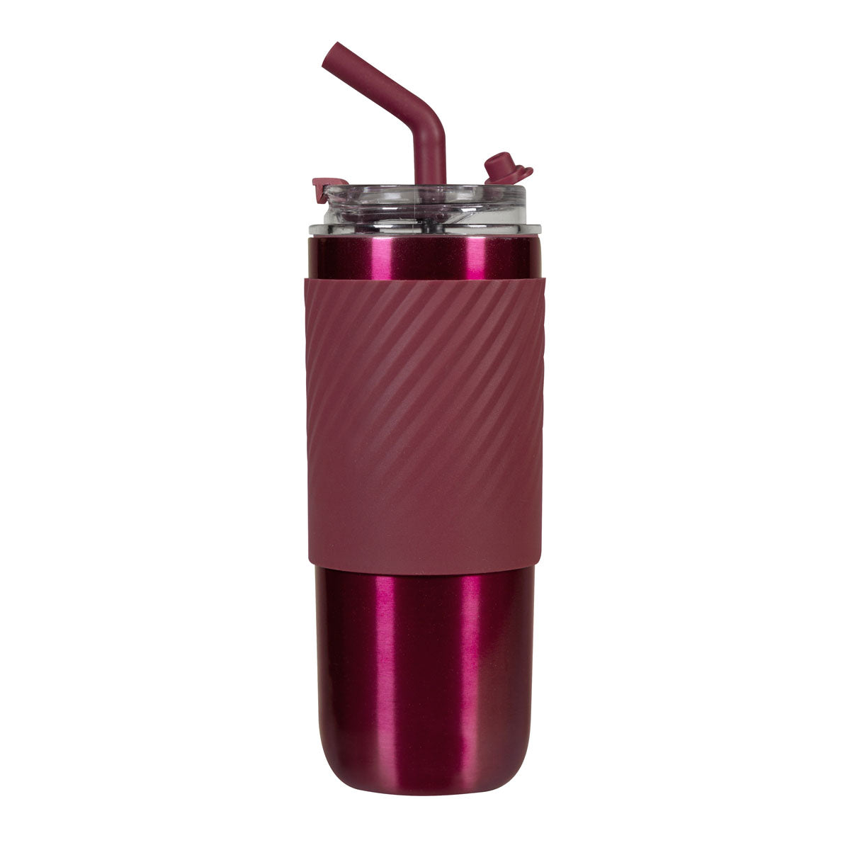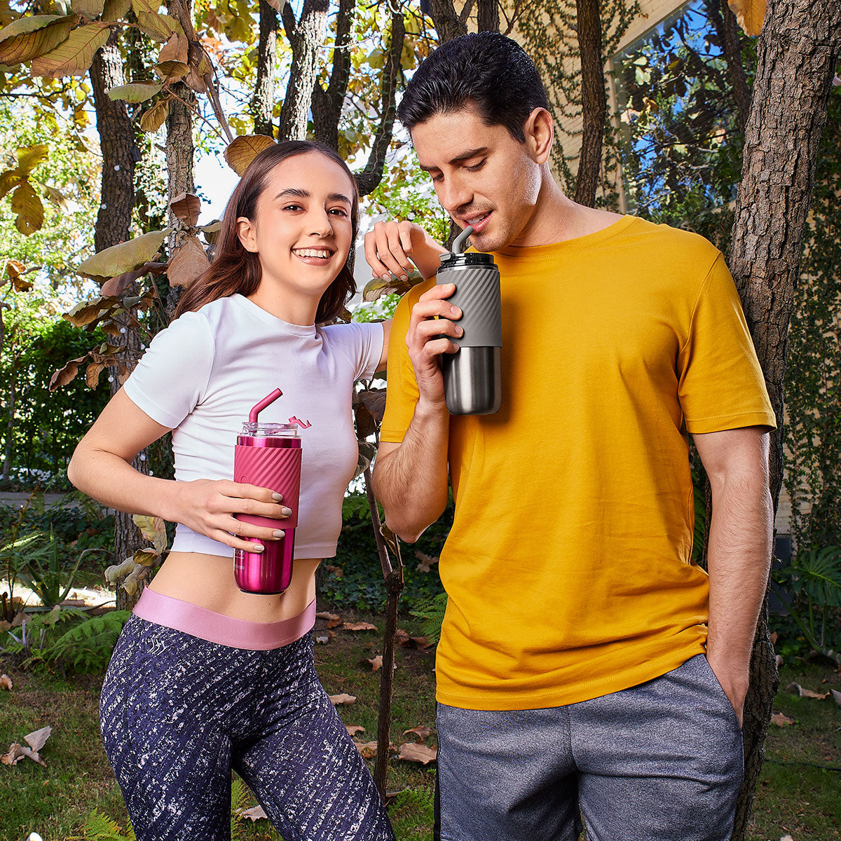 Doble pared. Cerrado al vacio. Pared interna y externa de acero inoxidable.Tapa con sistema de rosca, sobretapa de push y ranura especial con tapon para popote. Incluye popote metalico con boquilla de silicon. Banda de silicon antiderrapante. Mantiene la temperatura caliente por 6 hrs y fria 12 hrs aproximadamente.Caja individual incluida.