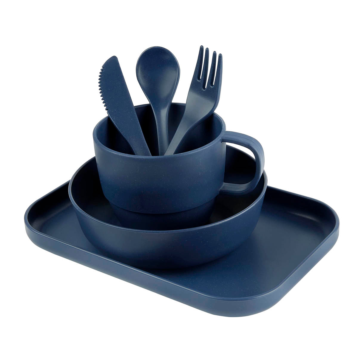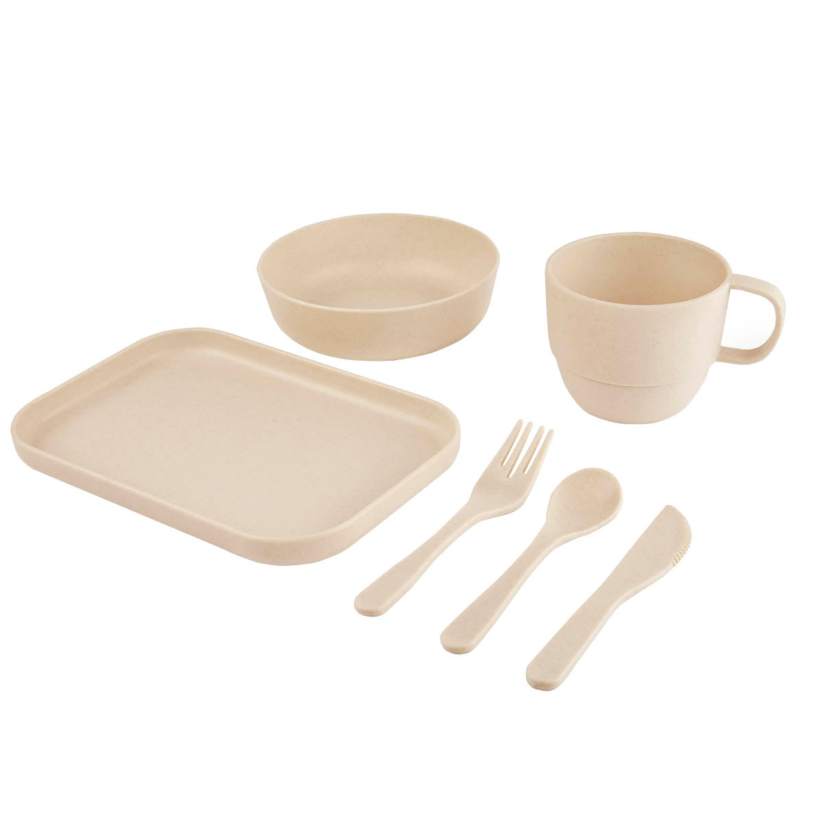 Vajilla de 6 piezas con material eco-friendly. Contiene plato extendido, plato hondo, taza, cuchara, tenedor y cuchillo. Con un diseño atractivo y funcional, es ideal tanto para los más pequeños como para los adultos, garantizando una experiencia de comida segura y respetuosa con el medio ambiente. Incluye caja individual. Apto para lavavajillas y microondas.