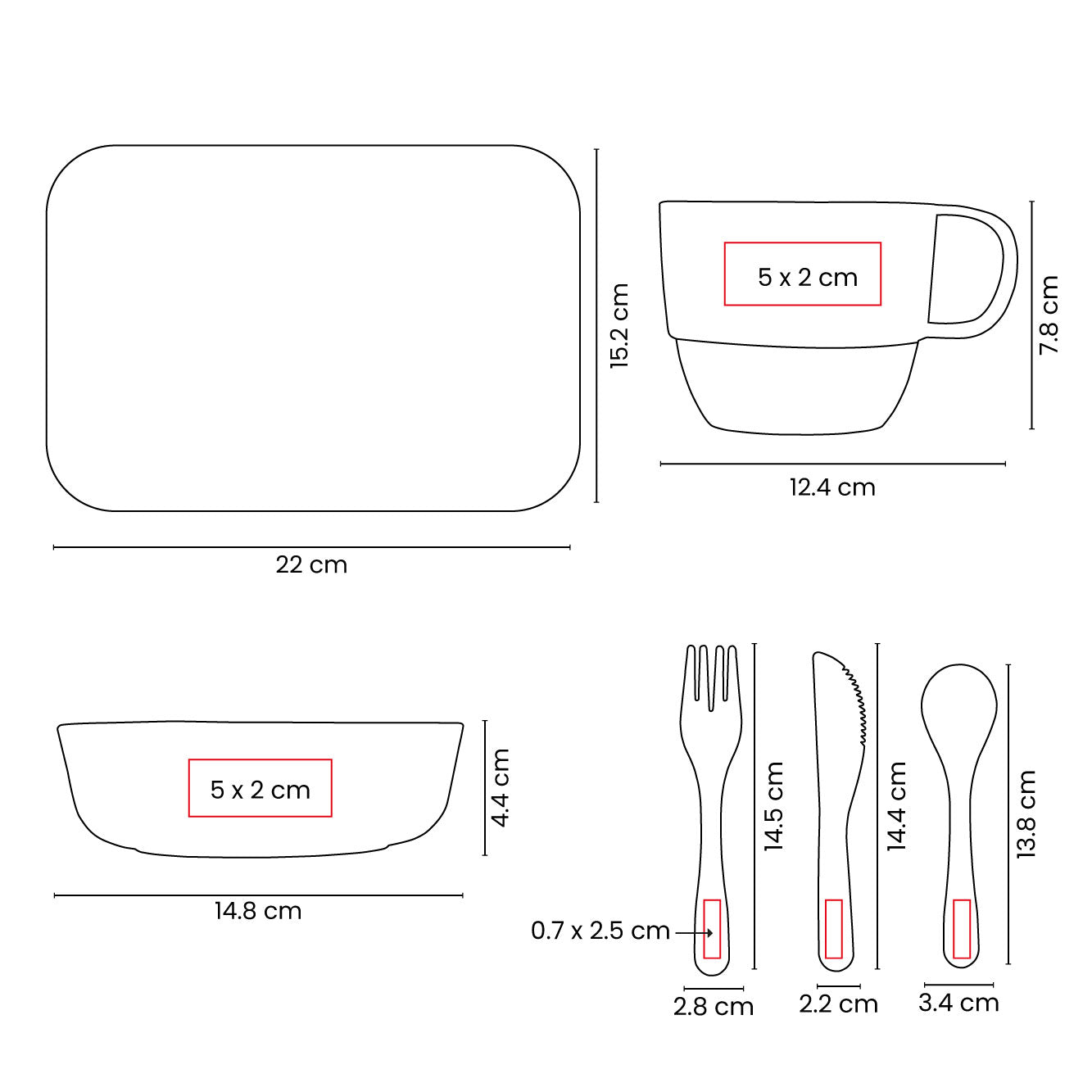 Medidas de producto: 22 x 15.2 cm Plato Extendido / 14.8 x 4.4 cm Plato Hondo / 12.4 x 7.8 x 9.5 cm Taza / 3.4 x 13.8 cm Cuchara / 2.8 x 14.5 cm Tenedor / 2.2 x 14.4 cm Cuchillo